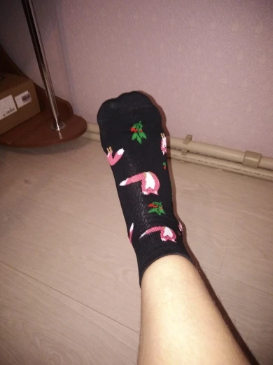 Рисунок четкий, яркий. Присутствует неприятный синтетический запах, но это не страшно, выветрится после стирки. Очень плотный носок, на зиму и очень самое то!