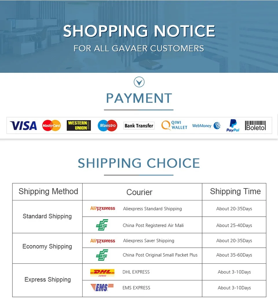 1. Доставка по всему миру. (За исключением некоторых стран и армейской почтовой службы/почтовых отделений флота)2. Заказы обрабатываются своевременно после подтверждения оплаты.3. Мы отправляем только по подтвержденным адресам заказа. Ваш адрес заказа должен совпадать с вашим адресом доставки.4. Представленные изображения не являются фактическим товаром и предназначены только для справки.5. Время доставки определяется перевозчиком и не включает выходные и праздничные дни. Сроки доставки могут меняться, особенно во время курортного сезона.6. Если вы не получили посылку в течение 30 дней с момента оплаты, пожалуйста, свяжитесь с нами. Мы отследим отправку и свяжемся с вами как можно скорее. Наша цель – удовлетворение клиентов!7. Из-за наличия на складе и разницы во времени, мы выберем доставку Вашего товара с нашего первого доступного склада для быстрой доставки.