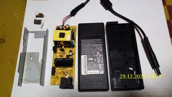 блок питания не проработал и двух минут. Задымился с характерным запахом электролита конденсатора. Продавец на контакт не выходит. Было принято решение вскрыть блок для диагностики. По факту имеем крайне некачественную подделку БП для ноутбуков НР у которой даже нет третьего провода отвечающего за инициализацию БП ноутбуком. В цепи 220 вольт отсутствуют элементы схемы отвечающие за фильтрацию и защиту от перенапряжения. Не озаботились даже припаять контакт заземления радиатора, просто загнули его в посадочном отверстии. В общем БП полный хлам
