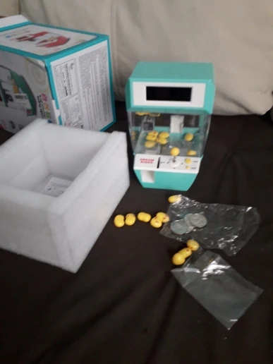 Огромное спасибо! Игрушка пришла в Архангельск за НЕДЕЛЮ. Такой быстрой доставки с али экспресс ещё не было) Упаковка надёжная, внутри коробки игрушка плотно упакована с мягким материалом, сверху коробка в пупырке. Игрушка работает от 3 мизинчиковых батареек. При включении сразу отображается время на табло. Монетку опускаешь и можно играть. Играет музыка, игрушки легко ловятся. Если поймал, играет победная музыка, при неудаче другая. Вместо прилагающихся игрушек можно засыпать небольшие конфетки. Заказывали ребёнку на День Рождения (в октябре), не ожидали, что придёт так быстро. Кстати, игрушка из качественного пластика, не одноразовая, не развалится при первом падении. Рекомендую к покупке!