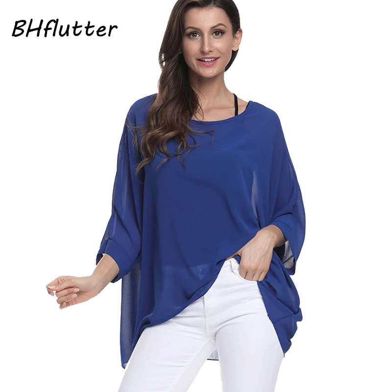 Женская шифоновая блузка BHflutter, Повседневная Свободная блузка с рукавом летучая мышь и круглым вырезом, Однотонная рубашка, размера плюс, лето 2018