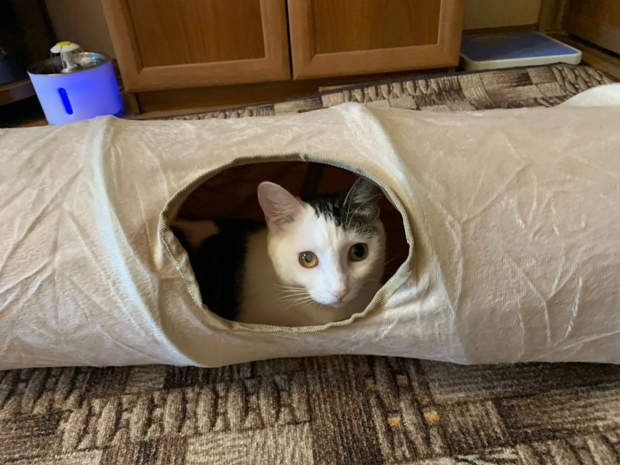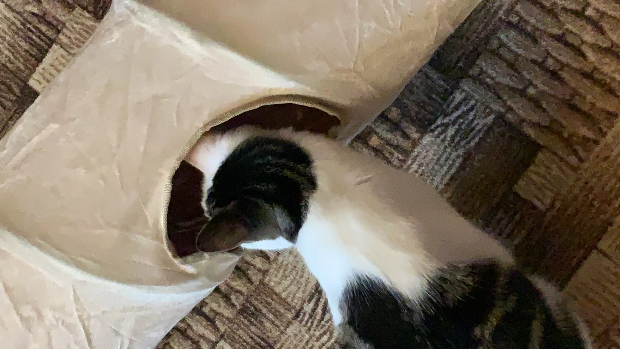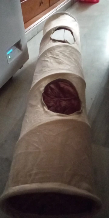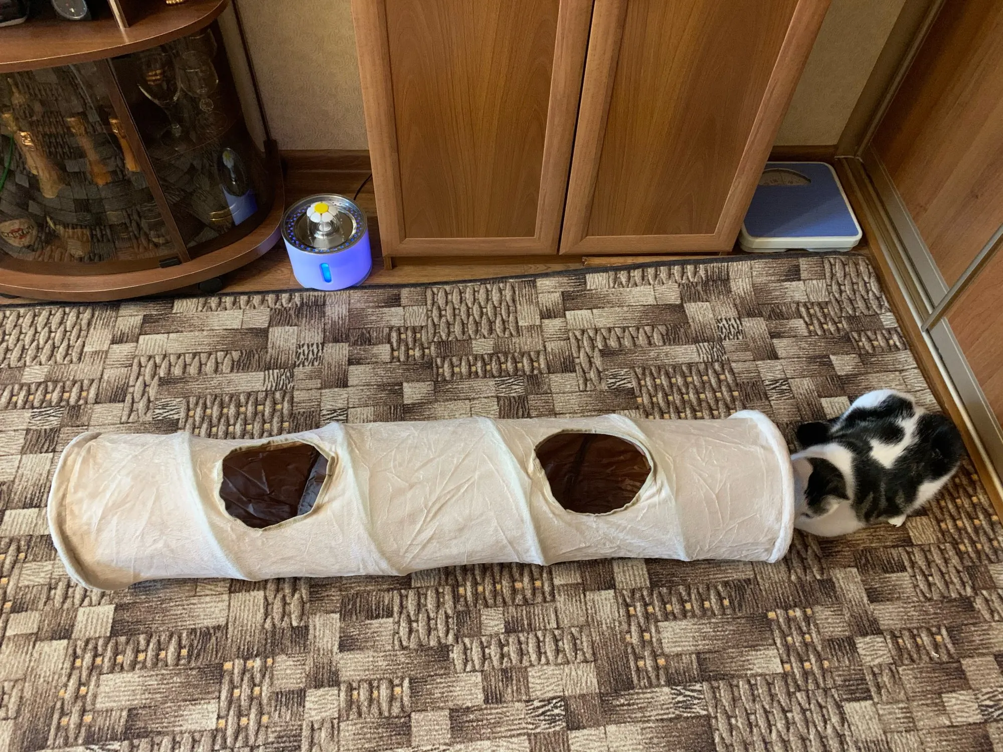 котам понравилось. внутри шуршащий материал, сверху нечто мягко - ворсистое. На " окнах " звцепов нет, соединить два трубы перпендикулярно не получится ( запаха нет. за счет лески внутри хорошо держит форму и сама раскрывается в трубу