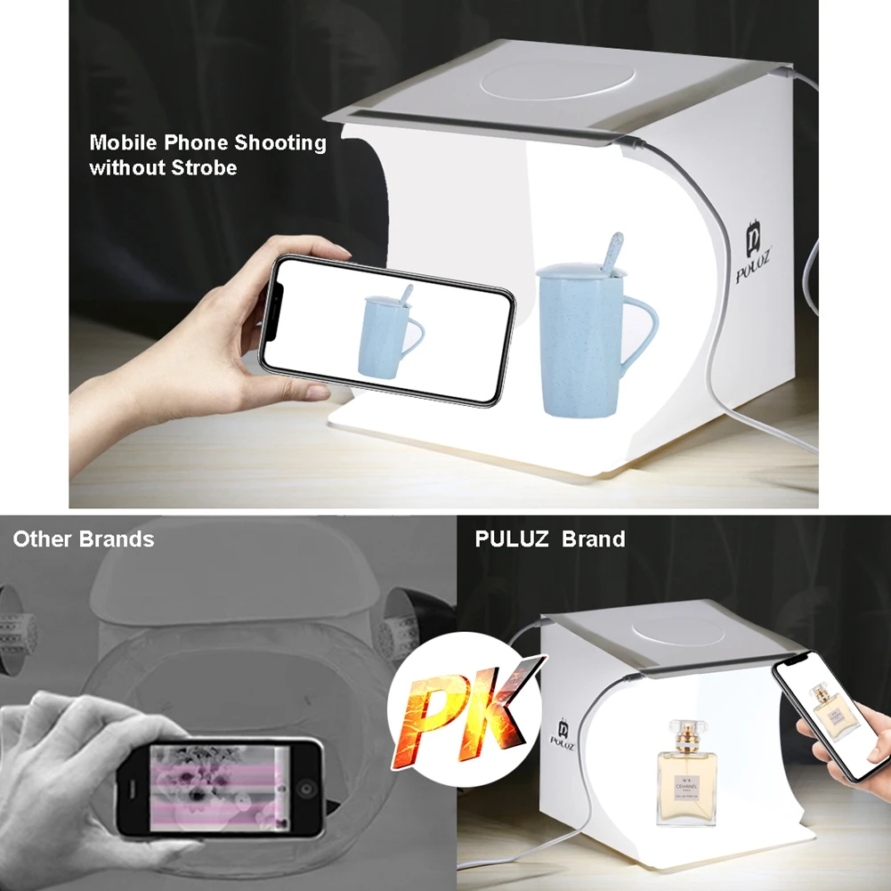 Универсальная Портативная студия, простая в использовании и разборке.Световая коробка для фотографий предназначена для небольших предметов для любителей фотографии, ремесленников, художников, студентов и других онлайн-продавцов, профессионалов и клиентов по рекламе продукта.Студия Light box позволяет быстро и легко снимать мелкие товары, такие как ювелирные изделия, аксессуары, игрушки, часы, гаджеты и другие предметы.Соберите свою собственную фотостудию в любом месте в течение нескольких минут, вы можете развернуть эту студию со светодиодной подсветкой и разместить ее на любой поверхности, чтобы получить идеальный фон для небольшой бизнес-фотографии, фотографируя их.Портативная складная конструкция кнопки, более удобная в установке и переноске, встроенная светодиодная лампа, обеспечивающая средний свет и Предотвращающая появление теней и отражений на фотографиях.С 6 панелями EVA (черный, белый, оранжевый, красный, зеленый, синий) и встроенной светодиодной панелью и usb-кабелем (вы должны подготовить Зарядное устройство USB, блок питания, или usb-концентратор для его питания).Мини и легкий, только как Книга в сложенном виде, легко брать в любом месте.