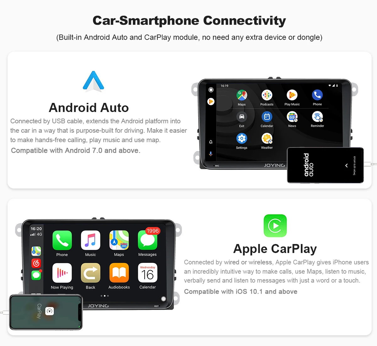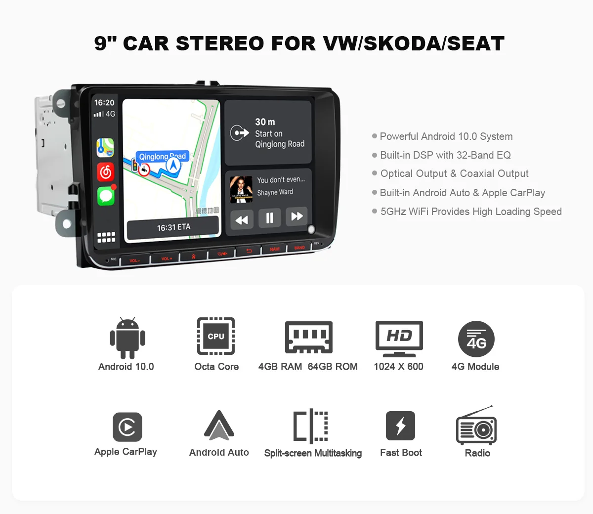 1. Совместимость с Android 10,0, UIS7862 восьми-ядерный 1,8 ГГц двухъядерный процессор ARM Mali G52 614,4 МГц 9 дюймов 1024*600 IPS HD Экран2. Супер аппаратная производительность, 4 Гб RAM + 64 ГБ ROM Octa Core3. Интернет развлечения, встроенный 5G WIFI модуль супер быстрое подключение к Интернету.4. Поддержка Google Play Store, вы можете скачать множество приложений5. Поддержка обратной камеры aftermarket/DVR/OBD2/DAB +/TPMS, вам нужно купить отдельно6. Поддержка быстрой загрузки, быстрое включение радио7. Поддержка кнопок управления рулевым колесом (без Canbus автомобиля)8. Bluetooth для handfree, Синхронизация Bluetooth телефонной книги9. Встроенный DSP, делает радио лучше звук и более Регулируемый эквалайзер10. Поддержка Apple carplay и Android autoНовый JOYING блок теперь поставляется с оптическим SPDIF цифровой аудиовыход * коаксиальный цифровой выход. Для максимального качества звука вы можете напрямую подключить внешний усилитель/DSP к цифровому выходу SPDIF; Если ваш внешний усилитель/DSP не поставляется с входом SPDIF, вам нужно будет подключить усилитель/DSP через FL/FR out & RL/RR out.