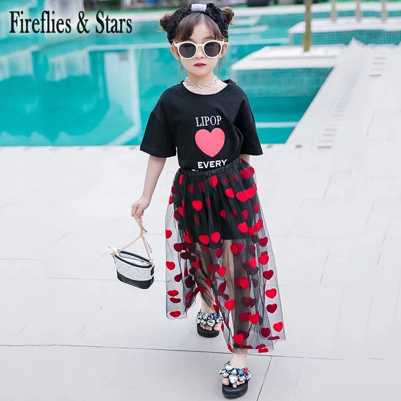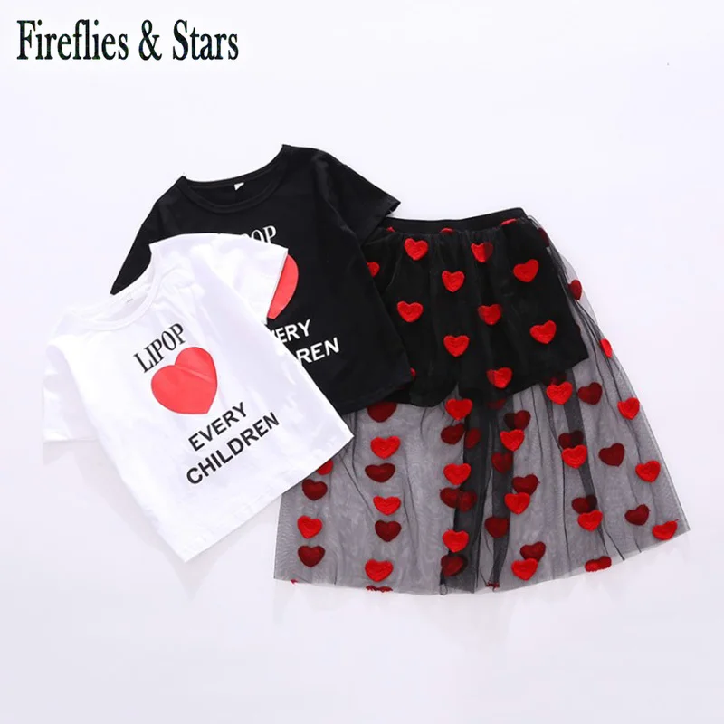 Название:Летний комплект из 2 предметов для девочек, детская футболка + юбка-пачка, Детский костюм, Детский комплект красного цвета с принтом букв и сердца, с вышивкой в сеточку, на возраст от 4 до 14 лет
