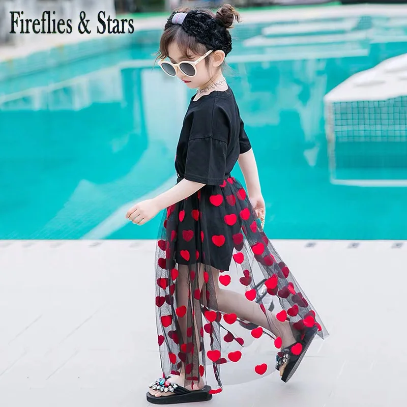 Летний комплект для девочек из 2 предметов, Детская футболка + юбка-пачка, Детский костюм, детская красная сетка с вышивкой, от 4 до 13 лет