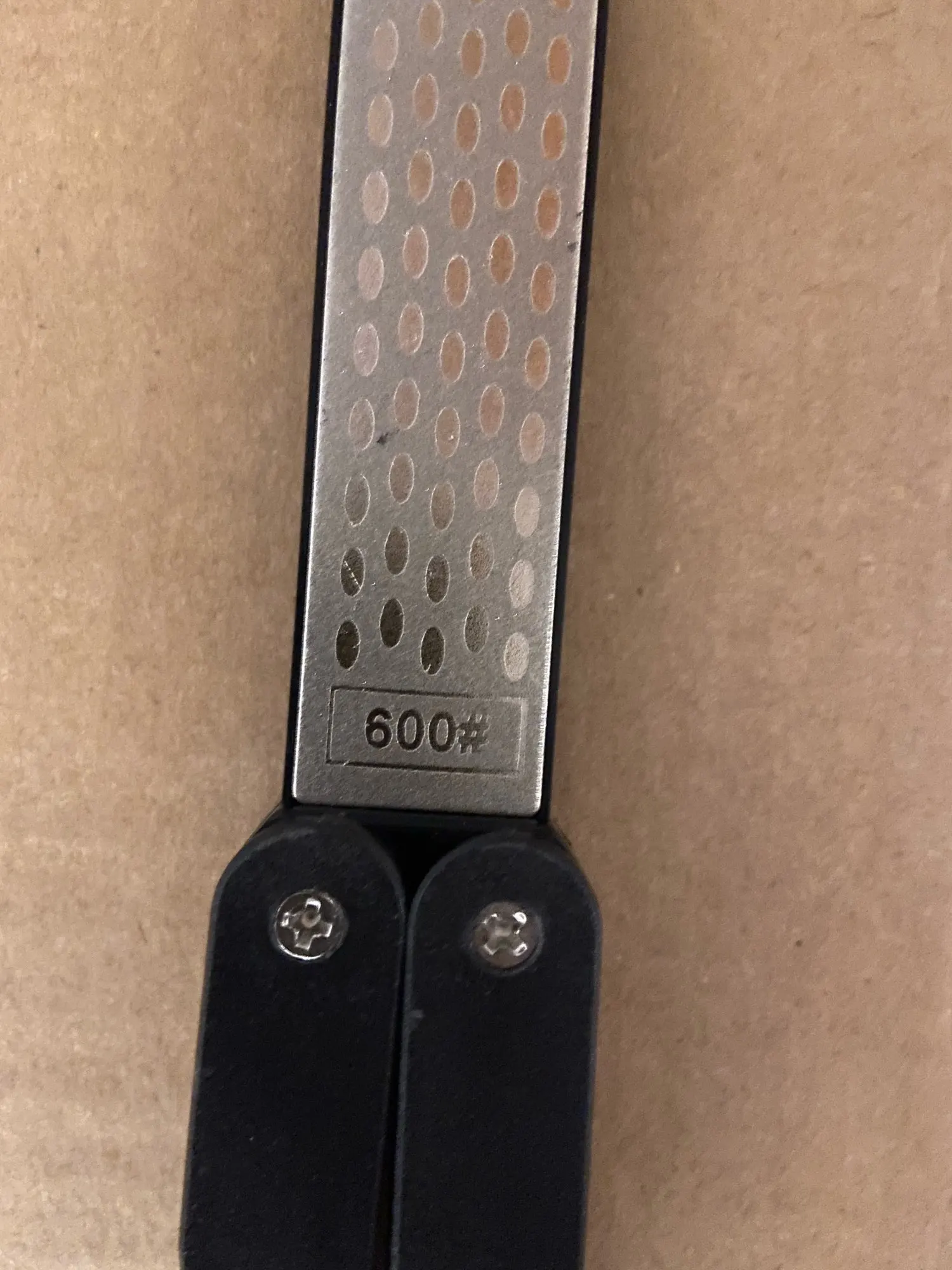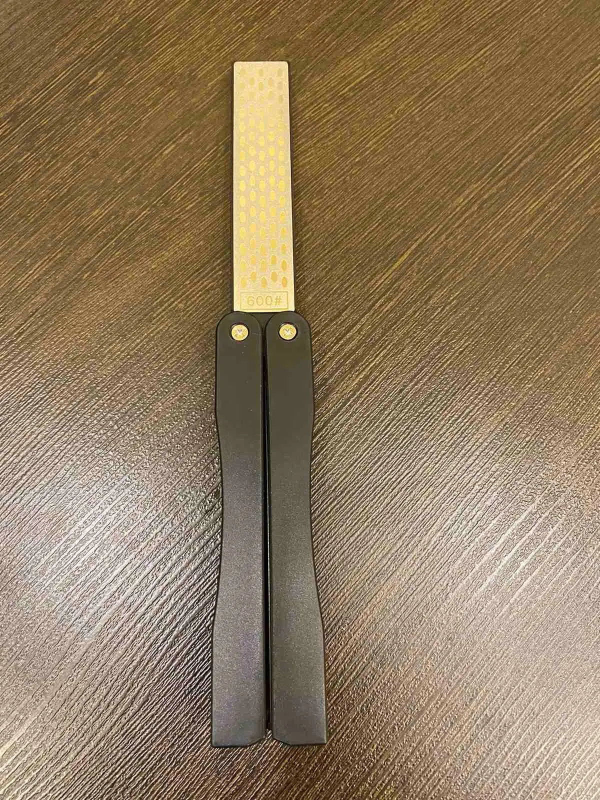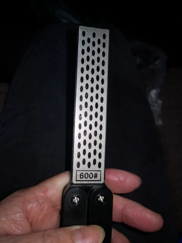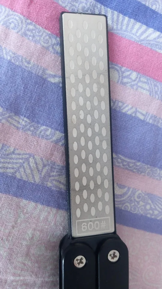 Хорошая точилка. 400 грид снимает большой слой металла. 600 грид доводит до остроты. Не бритва конечно, но для бытовых ножей годиться. Точить очень удобно, рукоятка попутно выполняет роль гарды, защищая руки от соскальзывания ножа при точении на себя.