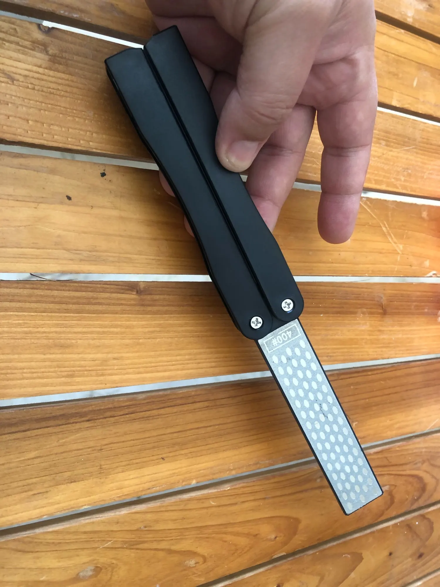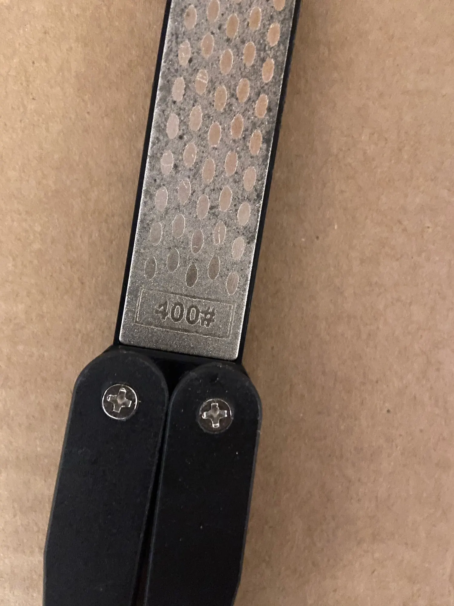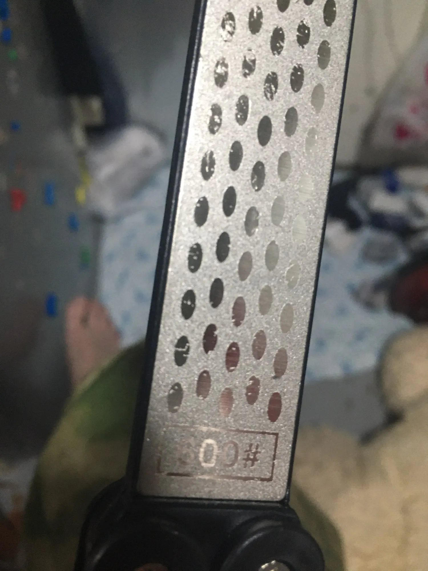 Хорошая точилка. 400 грид снимает большой слой металла. 600 грид доводит до остроты. Не бритва конечно, но для бытовых ножей годиться. Точить очень удобно, рукоятка попутно выполняет роль гарды, защищая руки от соскальзывания ножа при точении на себя.