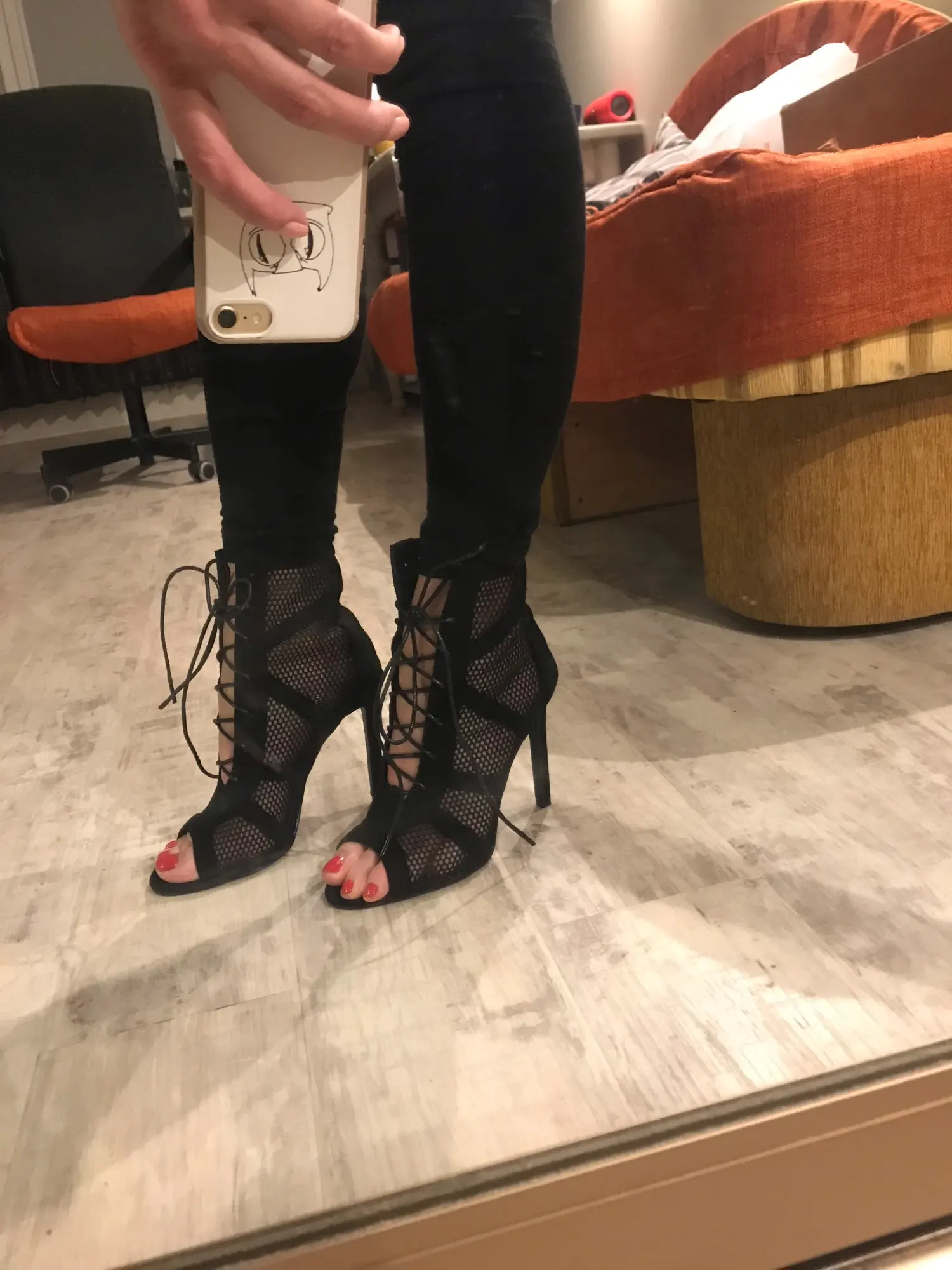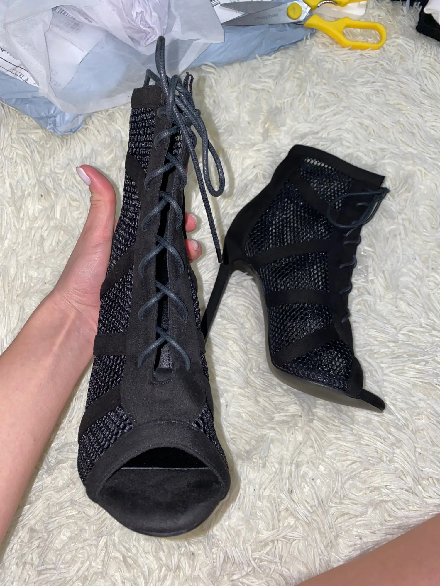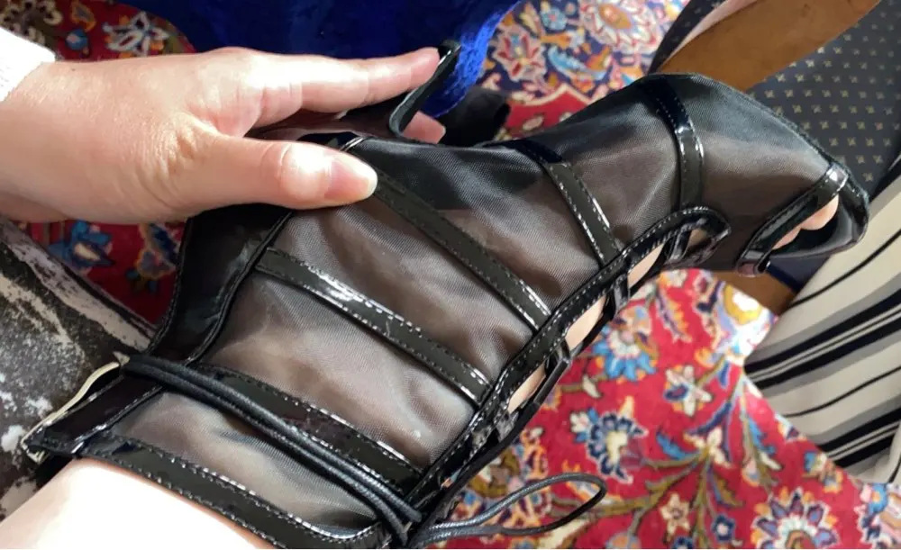 От упаковки очень сильный резкий неприятный запах, а сами туфли классные, каблук высокий очень, но стопа закреплена хорошо, пришли за 2,5 недели