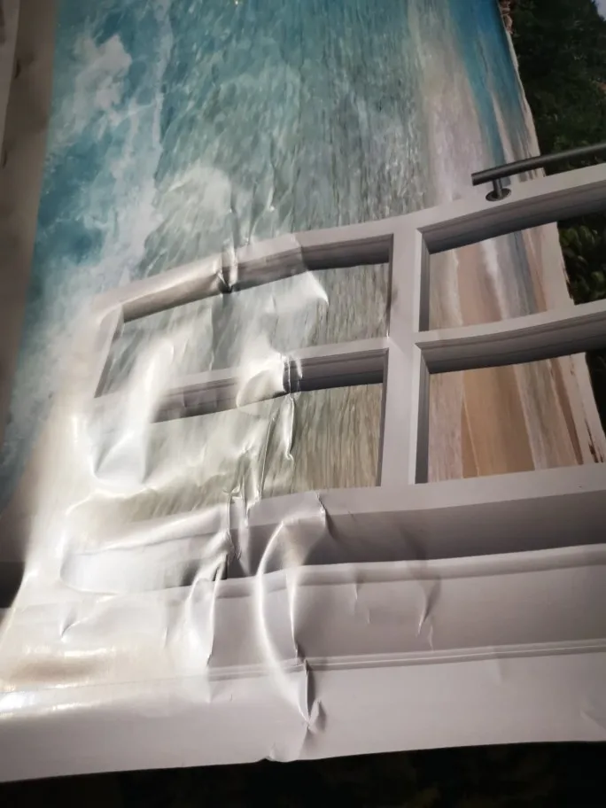 Пришла быстро, яркие цвета, с другой стороны липкий слой, самоклейка. Немного помялась, но не критично
