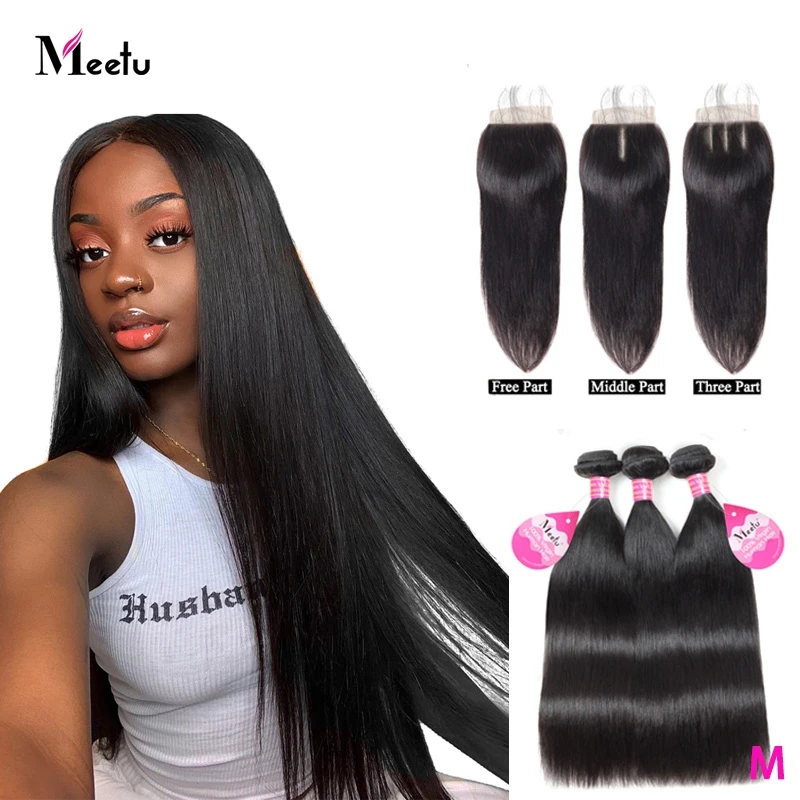 Прямые индийские пряди волос Meetu с закрытием, пряди человеческих волос с закрытием, не Реми 3 пряди с закрытием 4x4 кружева