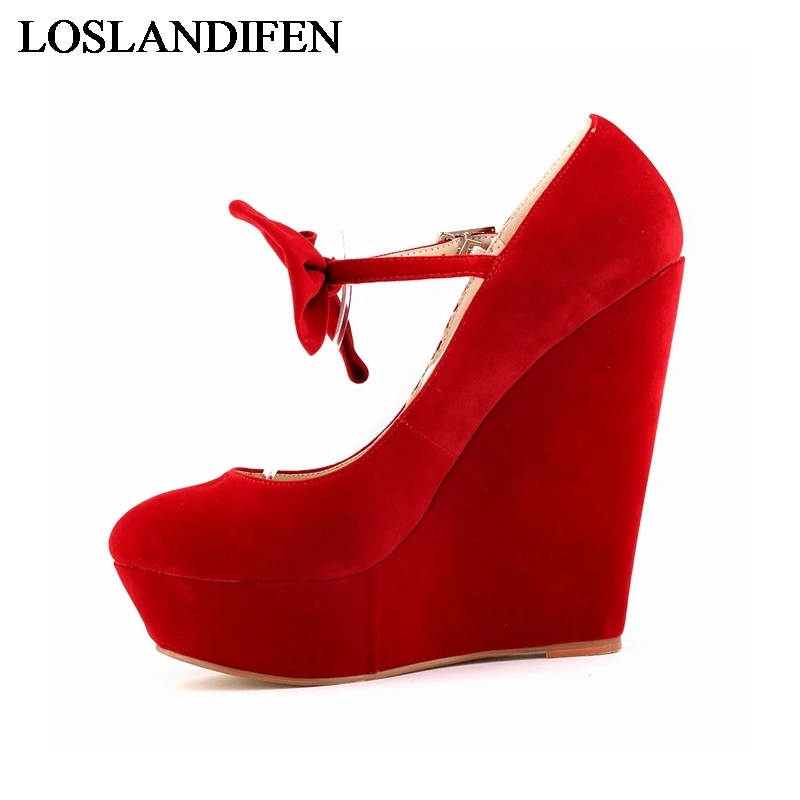 Женские Классические Изящные Roumd носком туфли-лодочки на каблуке на танкетке новый дизайн нубук обувь с ремешком; Весенние туфли-лодочки Большие размеры 3542 NLK-A0098