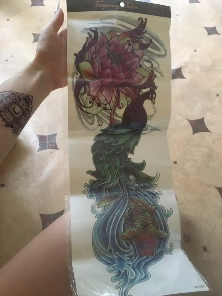 Моя самая любимая татуировка. Хотите быть в центре внимания? Срочно покупайте это тату, надевайте платье с коротким рукавом и Магия!!! Вы в центре внимания. Я пришла на вечеринку и ко мне подошёл каждый и сделал комплимент моей татуировке и никто даже не понял, что это наклейка. Смывается постепенно через 4-5 дней. Так что в итоге хожу около недели. На фото пятый день. До Москвы шла посылка 3 недели