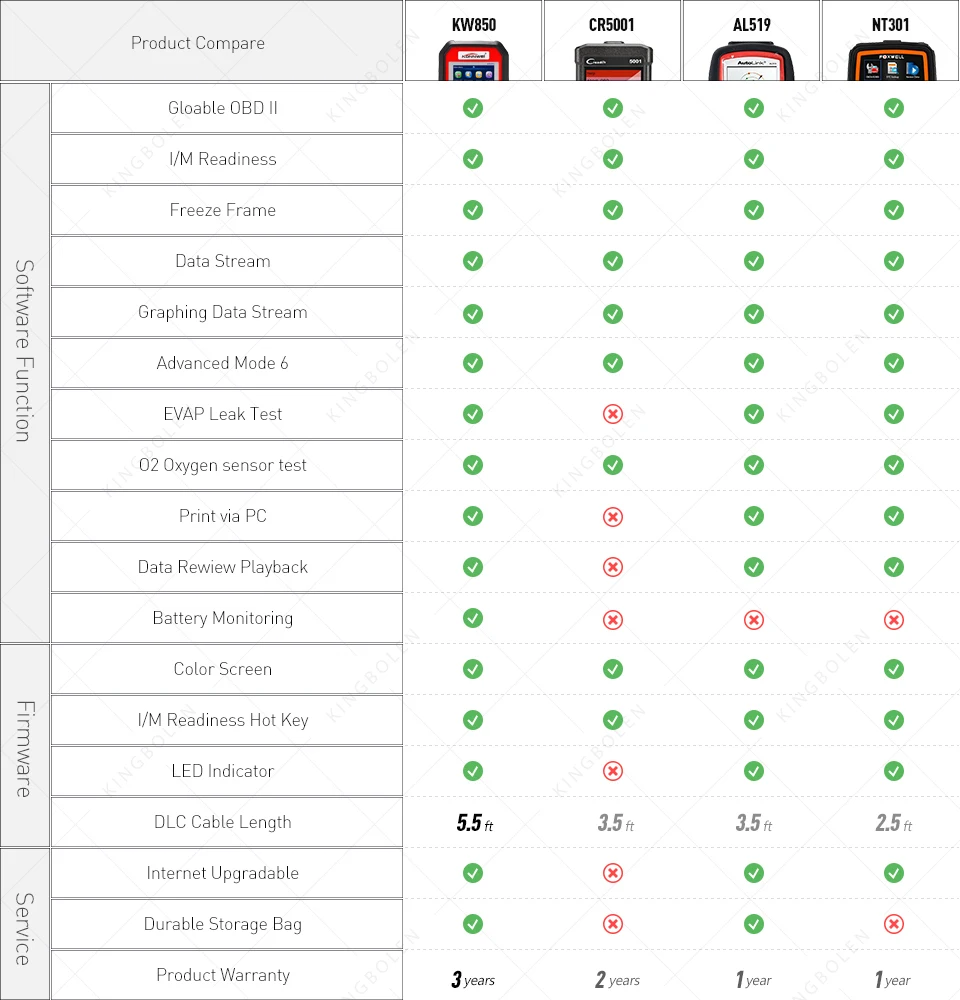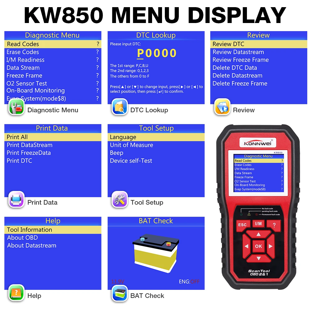 В отличие от других дешевых автомобильных диагностических сканеров, устройство считывания кода KW850 OBDII покрывает все диагностические функции OBDII/ EOBD для системы двигателя. Тест датчика O2, тест Системы EVAP и бортовой мониторинг дают вам полный контроль состояния вашего транспортного средства, В то время как Графический и цифровой дисплей живого потока данных поможет вам узнать неисправные показания датчика. (Пожалуйста, обратите внимание: Эта функция только для системы двигателя).