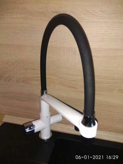 Очень быстрая доставка. Всего через 4 дня был у меня (Москва). Выглядит добротно, большой, тяжелый. Белый цвет крана-глянцевый( на фото кажется более матовым). Упакован хорошо. В работе уласться попробовать только через пару месяцев