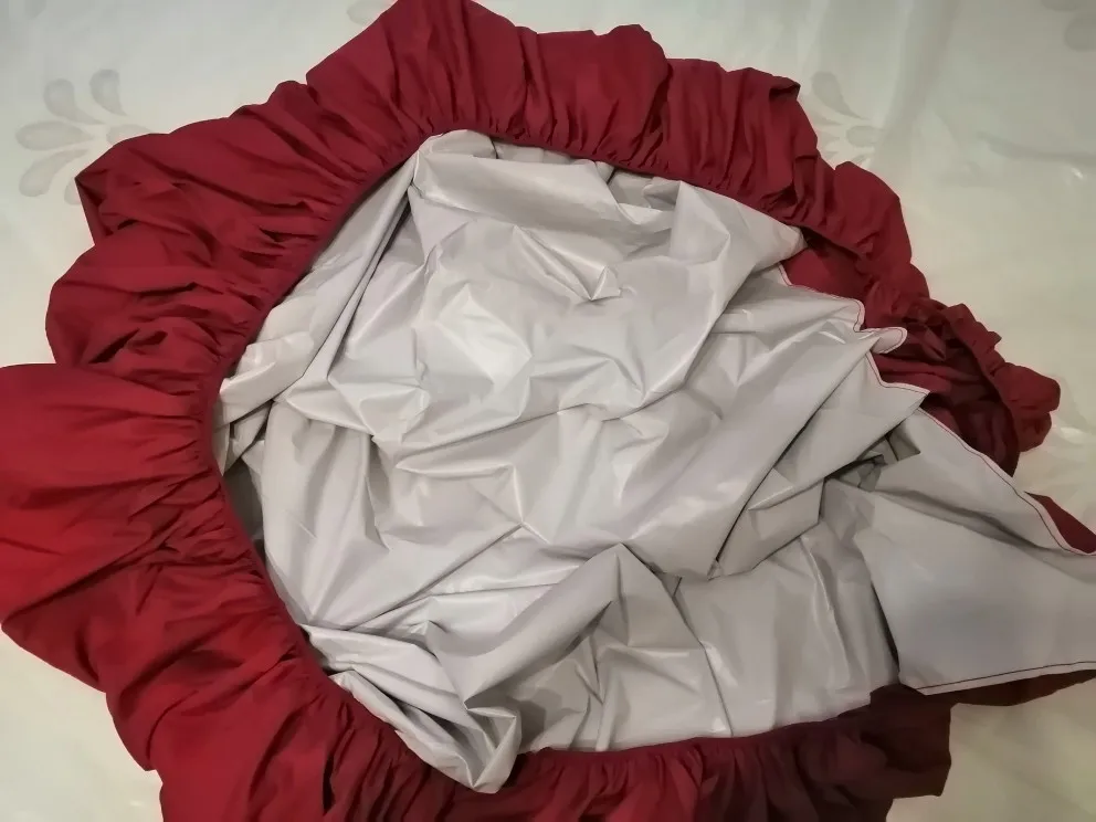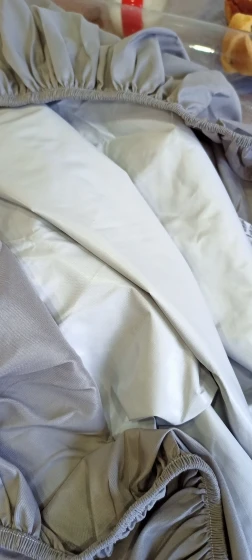 На вид всё нормально. Ткань сверху, внутри клеёнчатое покрытие. Боковины без клеёнки. Из-за этого взяла простыню большего размера. Цвет хороший, немаркий.