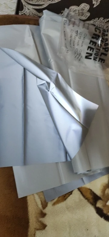 отличный экран из светоотражающей ткани. немного смят по линиям укладки, пока не гладил, изображение и так намного лучше против просто белой ткани. по факту огромная хрень размером с двуспальную кровать. ))) рекомендую.