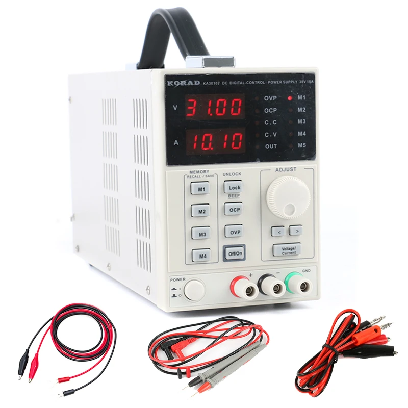 12. RS232, интерфейс USB Точно генерирует требуемое напряжение и ток.0-30 в Регулируемый Выход постоянного тока с высокой точностью.Разрешение 10 мВ и 1 мА. Профессиональный дизайн источника питания с интуитивно понятной работоспособностью.Простое и интуитивно понятное управление, быстрый и точный выбор напряжения и тока. Для предотвращения повреждения нагрузкиМожет быть установлено значение защиты от перенапряжения и защиты от перегрузки по току, чтобы предотвратить выход регулятора напряжения за пределы порогаКнопки панели блокировки keyguard предотвращают нежелательные результаты при тестировании ключей 5 пользовательских программируемых предустановленных настроекПросто нажмите кнопку, чтобы вызвать и сохранить область, чтобы открыть пользователю для хранения данных и сохранения пользовательских настроек Спецификация: Условия эксплуатации:Входное напряжение: 220 В +/-10%Частотный диапазон: 50- 60 ГцРабочая температура: 32-104 ℉ (0-40 °C)Влажность при эксплуатации: < 80% относительной влажностиТемпература хранения: 32-158 ℉ (0-70 °C)Влажность при хранении: < 70% относительной влажности Стабильное напряжение:Диапазон выходного напряжения: 0-30 в, плавная регулировкаРазрешение настройки: 10 мВТочность настройки: <0.05% + 20 мВПульсация: < 1 мврмТочность считывания: 10 мВТемпература. Коэффициент: < 0.1% + 10 мВСчитывание температуры. Коэффициент: < 100 ppm + 10 mV Стабильный ток:Диапазон выходного тока: 0-10 А, плавная регулировкаРазрешение настройки: 1 мАТочность настройки: <0.1% + 3 мАПульсация: < 3 мрамораТочность считывания: 1 мАТемпература. Коэффициент: < 0.1% + 5 мАСчитывание температуры. Коэффициент: < 100 ppm + 5 mAРазмеры: 4,3x6,1x122,05 дюйма (110x156x310 мм)