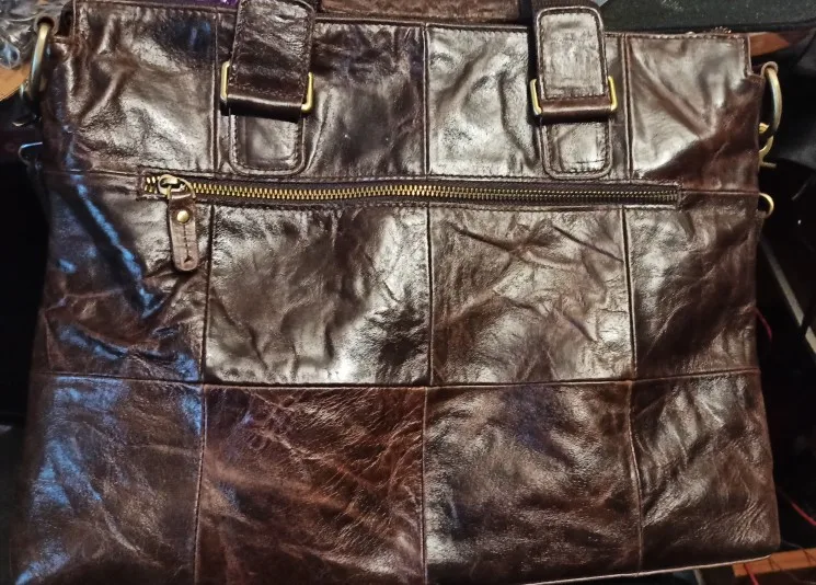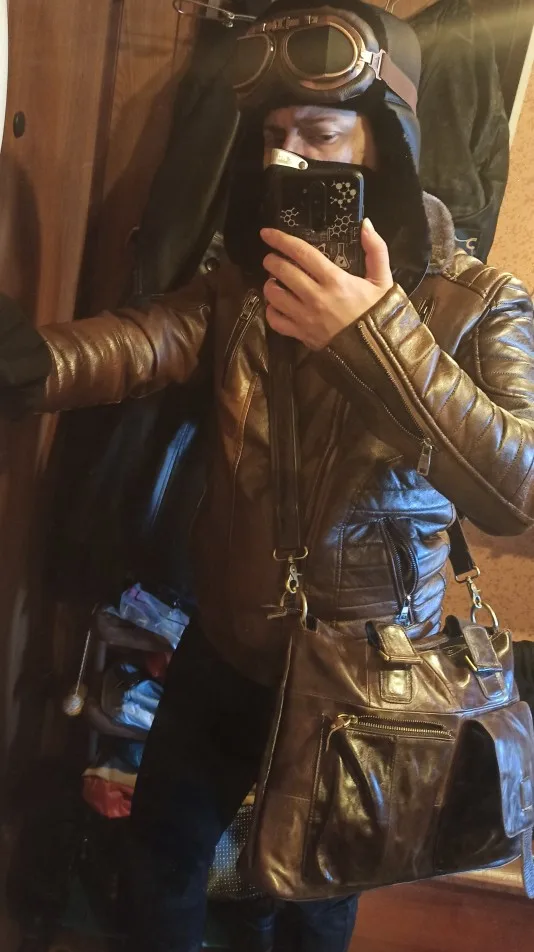 Красота. Но удобство и вместительность под некоторым вопросом. Главное, что папка средней набитости влезает хорошо и беспрепятственно. Но за продуктами с такой уже не сходишь. Ширина у нее вообще не предусмотрена. Смотрится здорово. Сначала как-то не оценил, плюс торчало довольно много ниток, которые я сидел и поджигал минут 10, пока все не стало достаточно аккуратно, но после этого и распрямив ее после некоторой деформации на морозе – сумка сделана из довольно плотной кожи, что тоже не слишком удобно, – она прям заиграла новыми красками. Есть странная ничем не стираемая ляпка сзади, 2 фото. Доставили до Владивостока достаточно быстро, недели за 2+, насколько помню, спасибо.