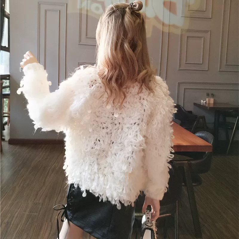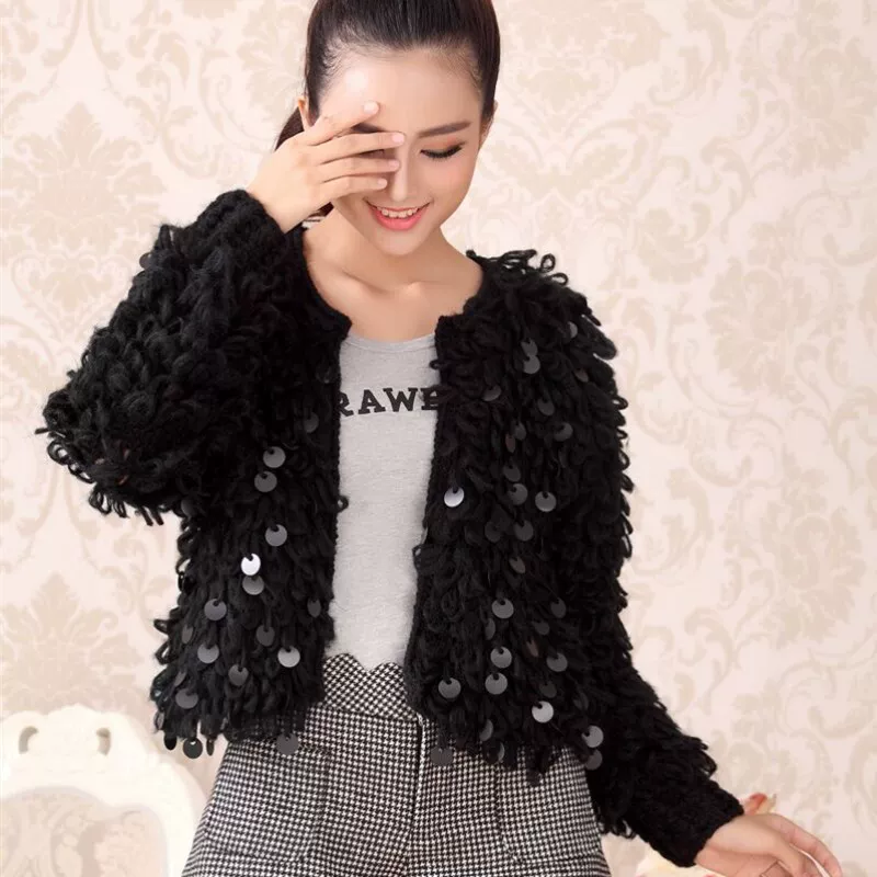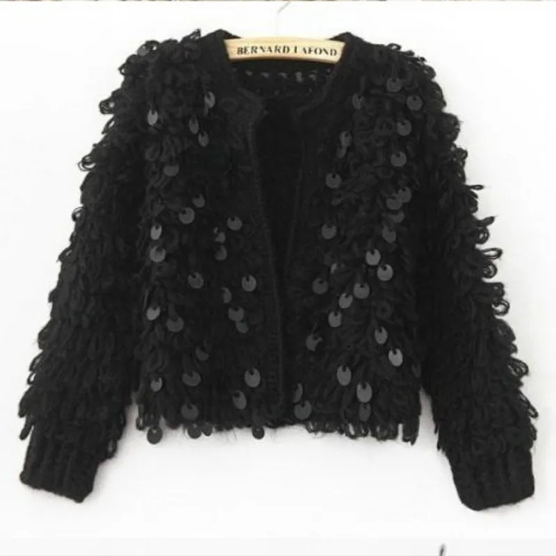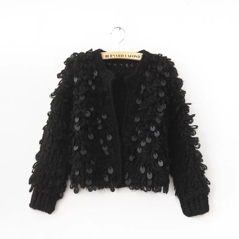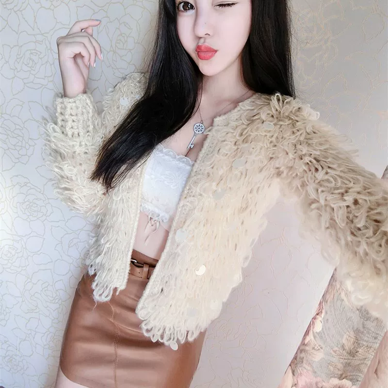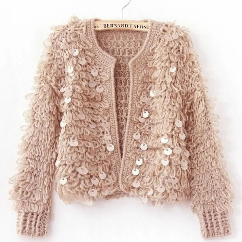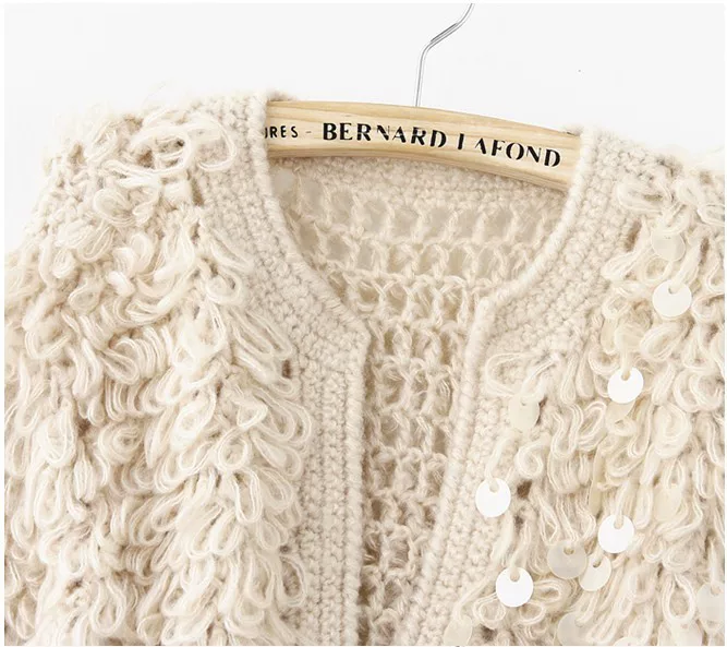 Женский мохеровый ажурный вязаный кардиган с блестками, свитер, модное короткое пальто с блестками, уличная одежда с открытым стежком