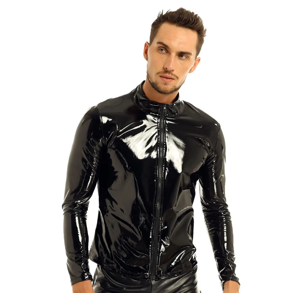 Мужская блестящая рубашка iiniim из лакированной кожи, с длинными рукавами, воротником-стойкой и молнией спереди
