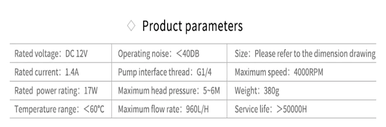 Тип насоса: ручное регулирование скорости или ШИМСкорость нагрузки: Макс 3000 об/минПотребляемая мощность напряжения: DC12VМощность: 17 ВтВыход головки: 5,5 метровМаксимальный поток: 960л/чРазмер: 62*62*48,5 мм