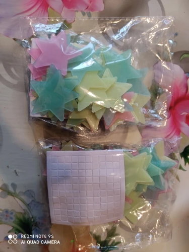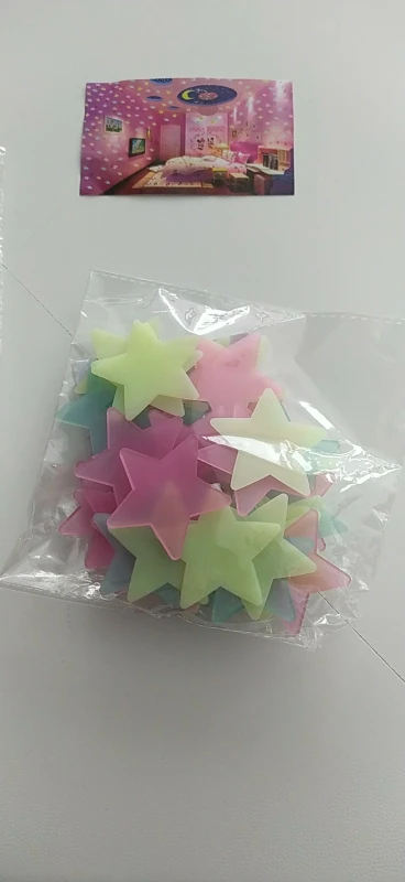 Товар пришёл очень быстро, звездочки очень милые, все светятся зеленым, в комплекте были наклейки для того чтобы прикрепить звезды. ((๑˃̵ ᴗ ˂̵)و