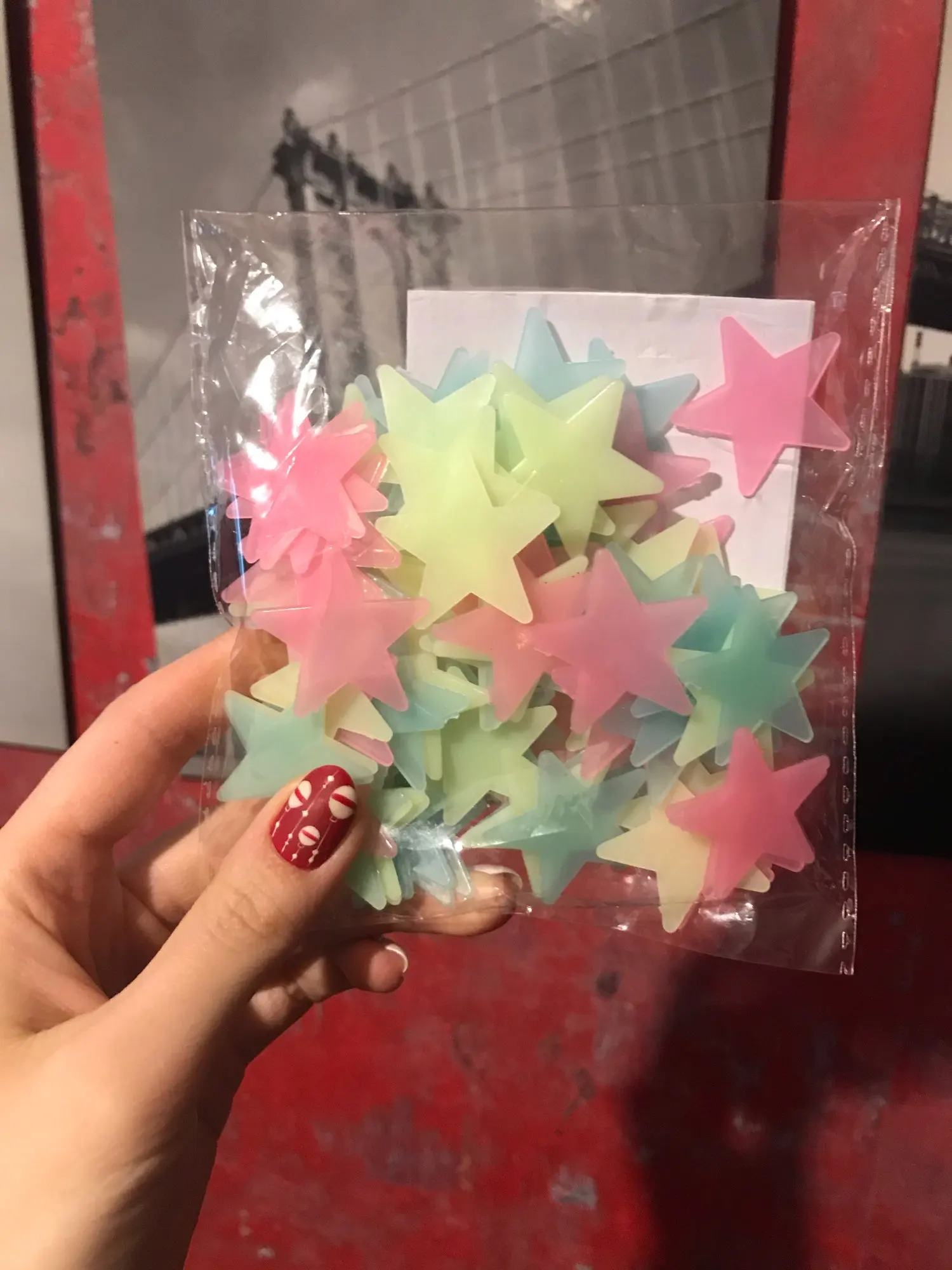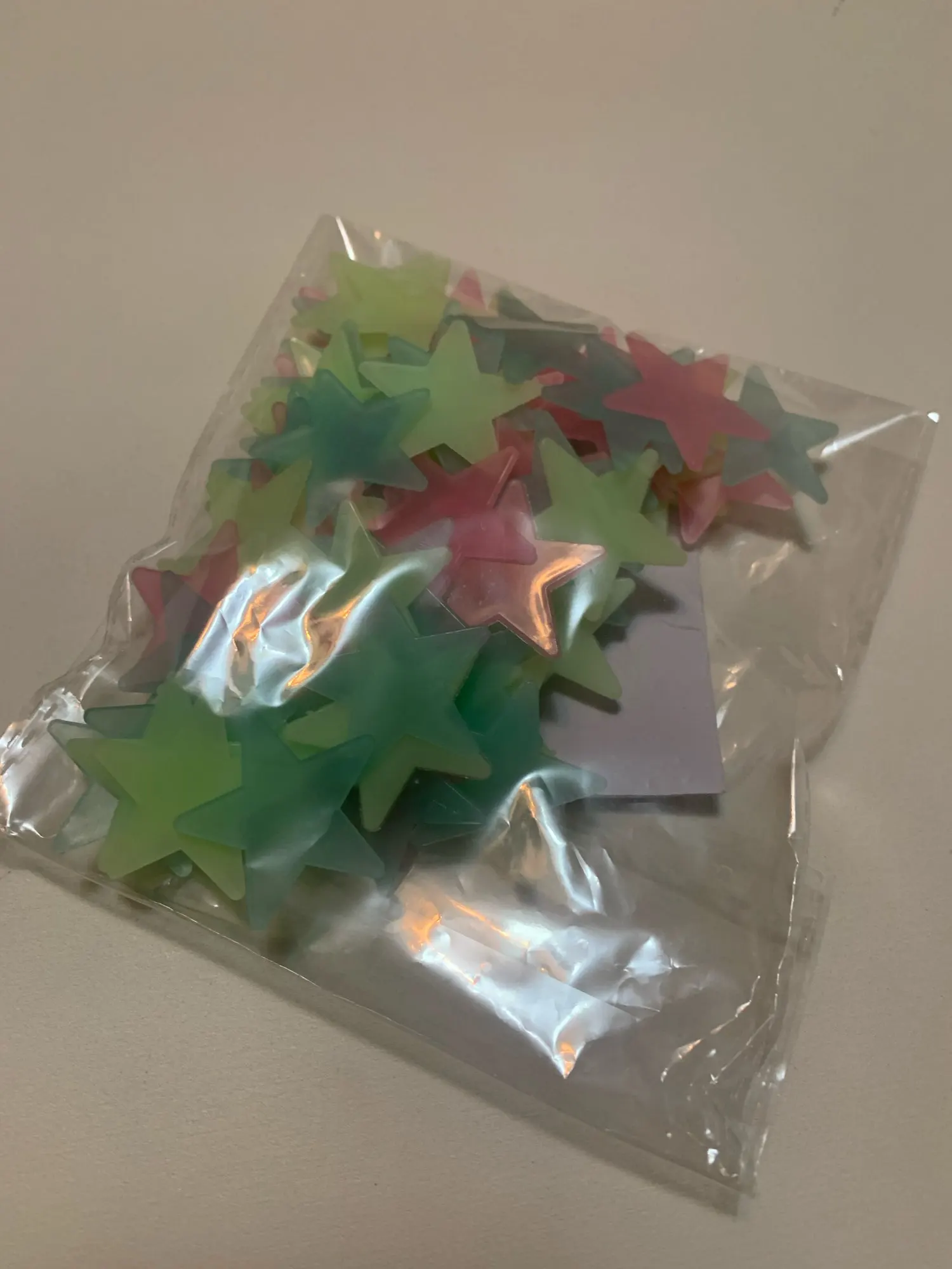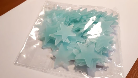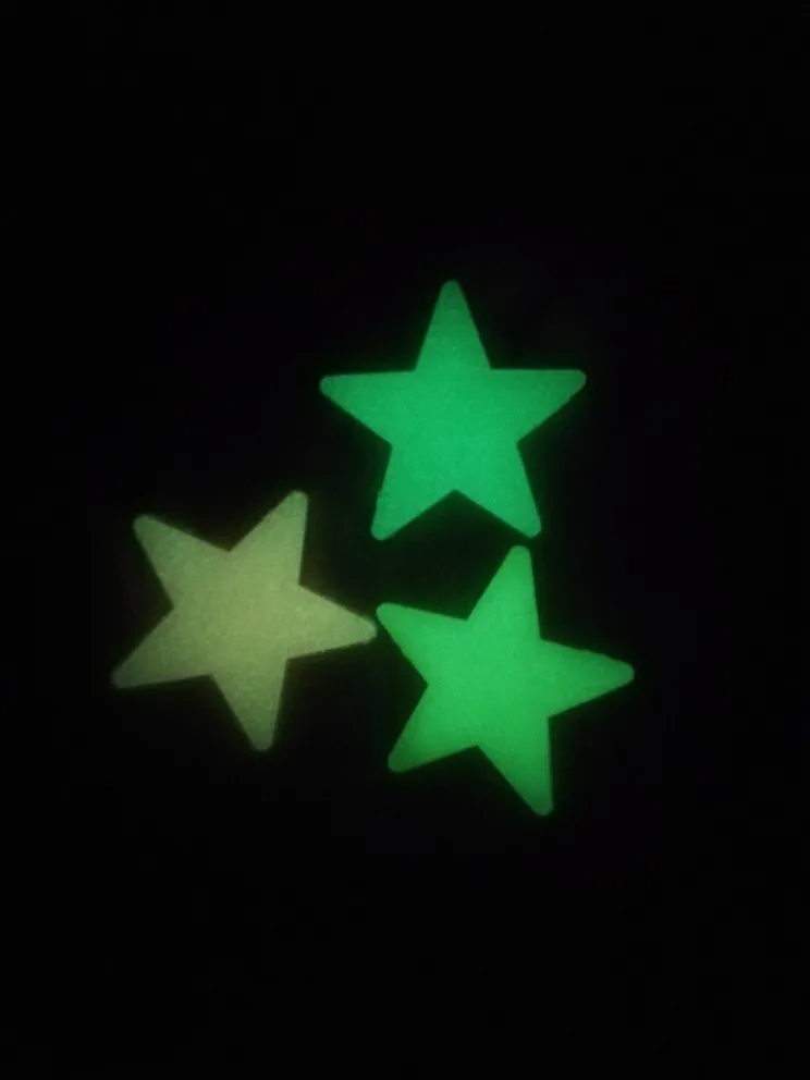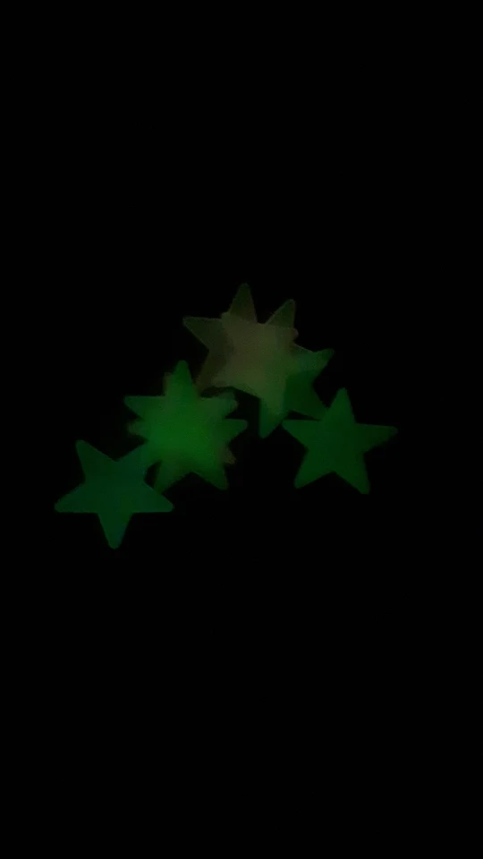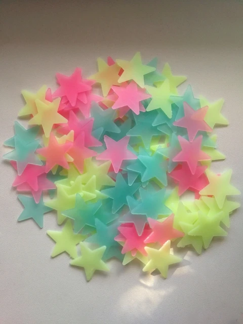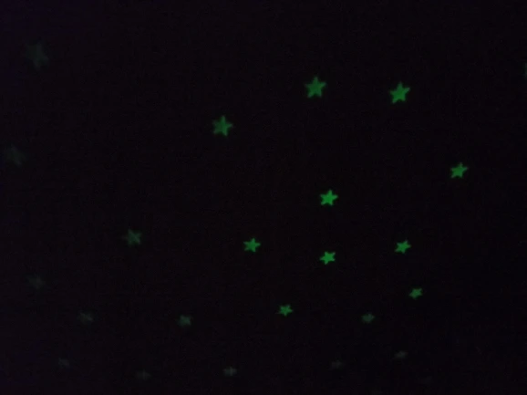 Очень даже неплохие звёздочки. Клеятся на спецальные липкие квадратики. Быстро заряжаются от света. Только вот недолго светят.