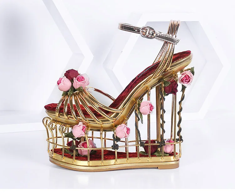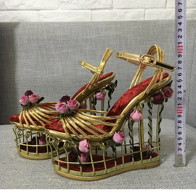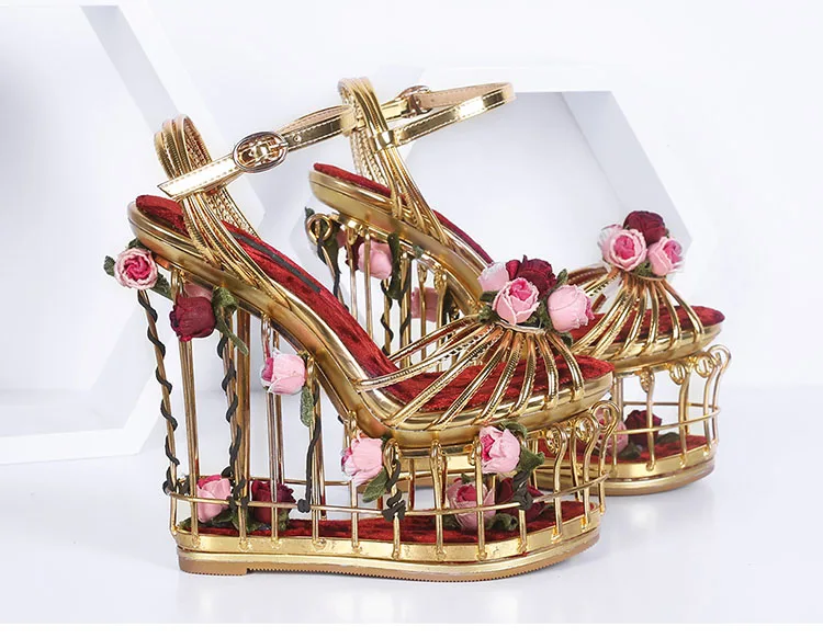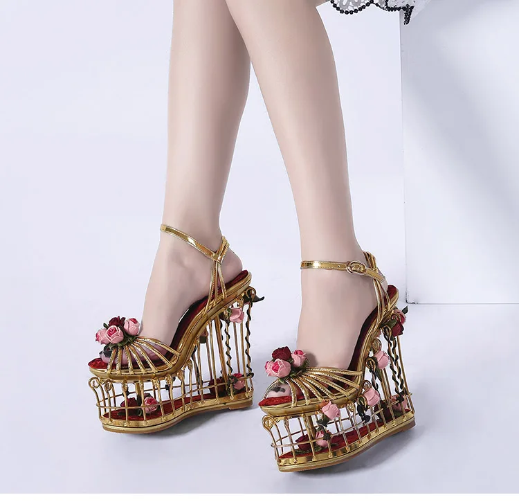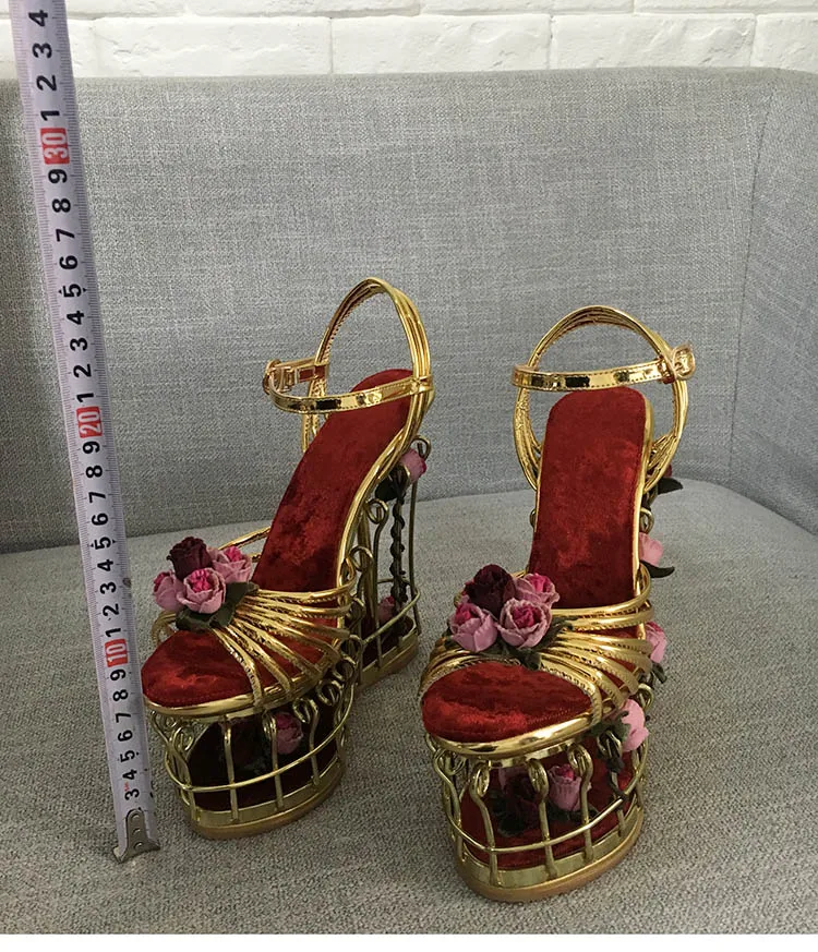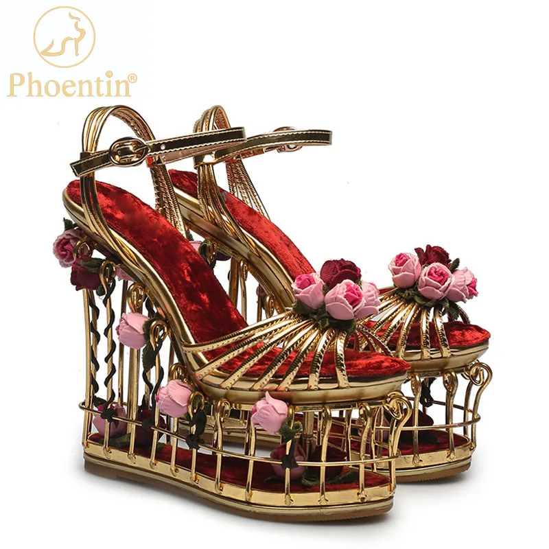 Женские босоножки на очень высоком каблуке 16 см, с золотыми цветами, на платформе, с ремешком на щиколотке и пряжкой, FT337
