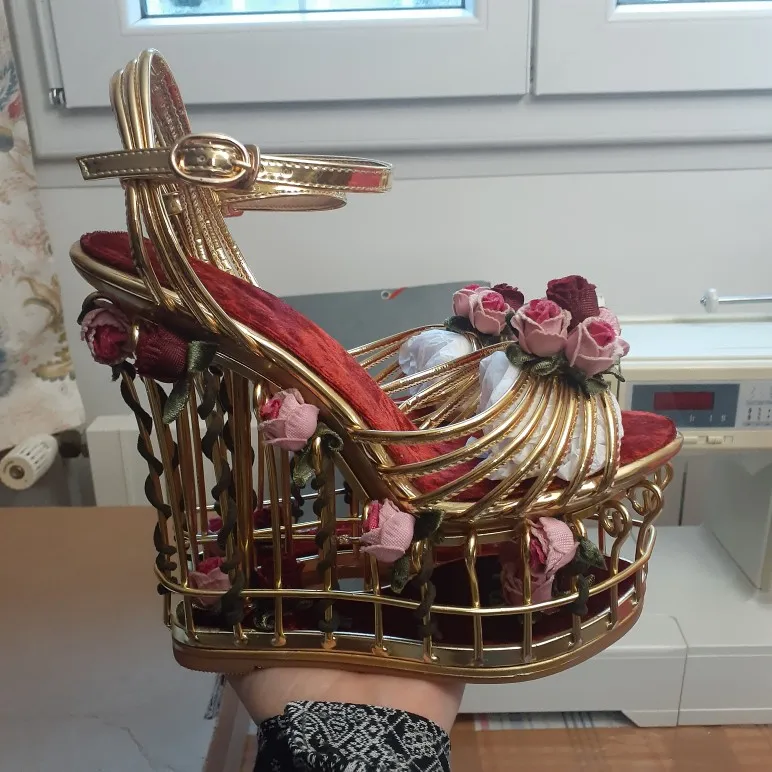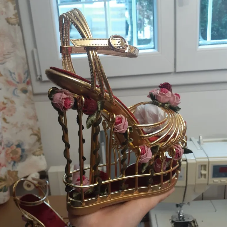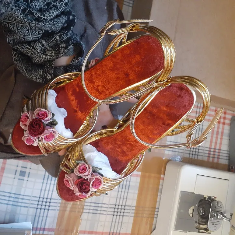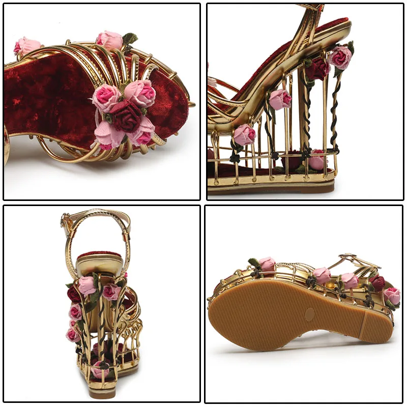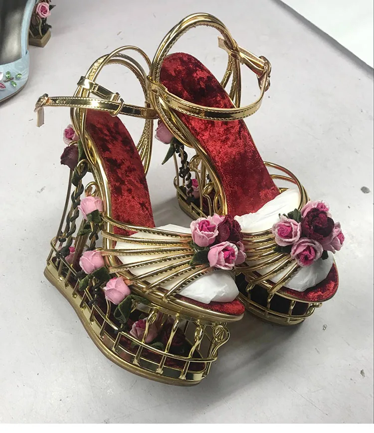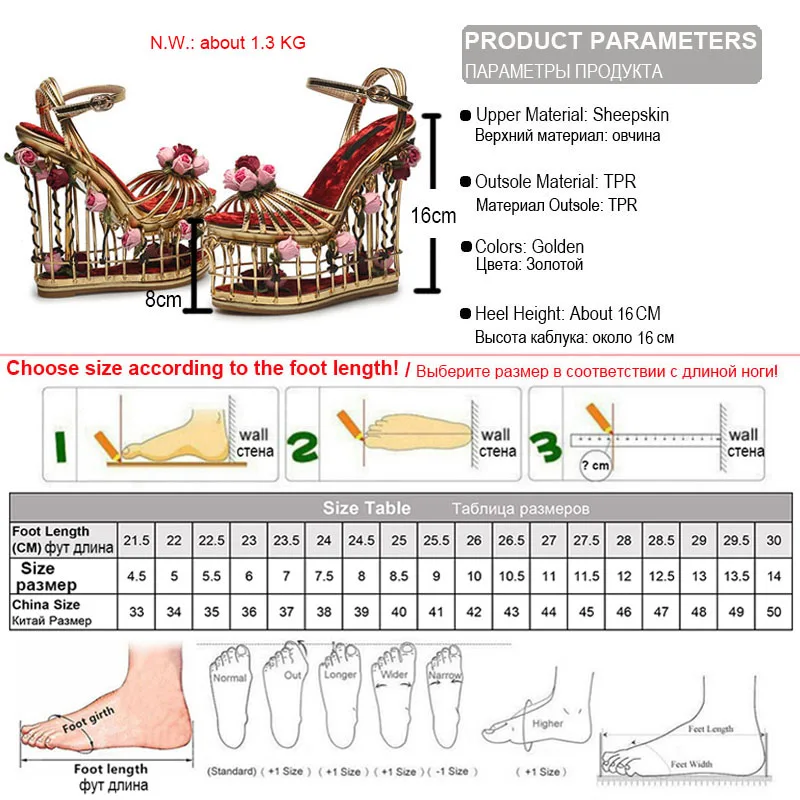 Женские босоножки на очень высоком каблуке 16 см, с золотыми цветами, на платформе, с ремешком на щиколотке и пряжкой, FT337