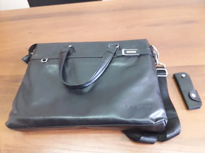 Сумка скорее мягкая, хорошо подойдёт для переноски документов, влезает небольшая папка А4 на кольцах, есть место для айпада, 2 кармана с внешней стороны на молниях. Молнии мягкие, кожзам приятный, строчки ровные. Если бы не плашка на лицевой стороне, было бы просто идеально. Да, ремень на плечо не из кожзам, а из ткани, но выглядит очень хорошо. Посылка приехала в Москву мега быстро, 11.11 заказала, 25.11 получила на почте. Щ Запаковано аккуратно, но края чуть помялись. В наборе шли также бумажник (влезает смартфон) и ключница из того же материала. Прям стильненько
