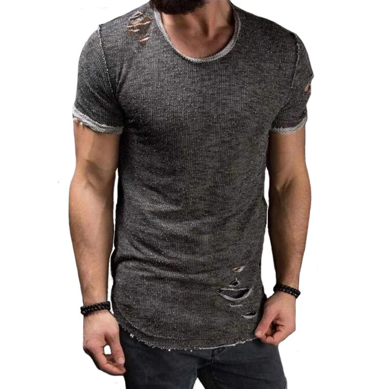 Футболка мужская с круглым вырезом, хлопок, короткий рукав, с дырками, однотонная, лето 2021