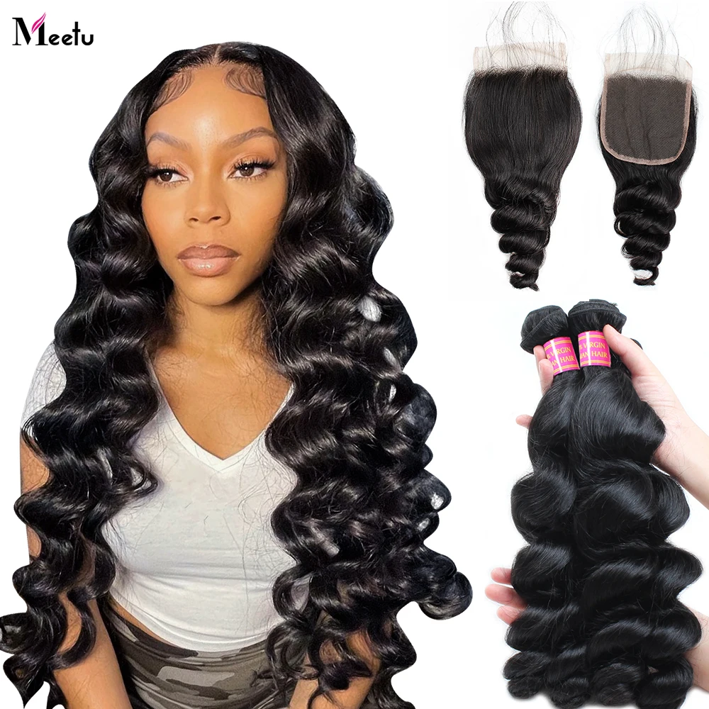 Meetu свободные волнистые пучки с застежкой 4 пряди с застежкой перуанские человеческие волосы пучки с застежкой 4x4 не Реми пряди волос