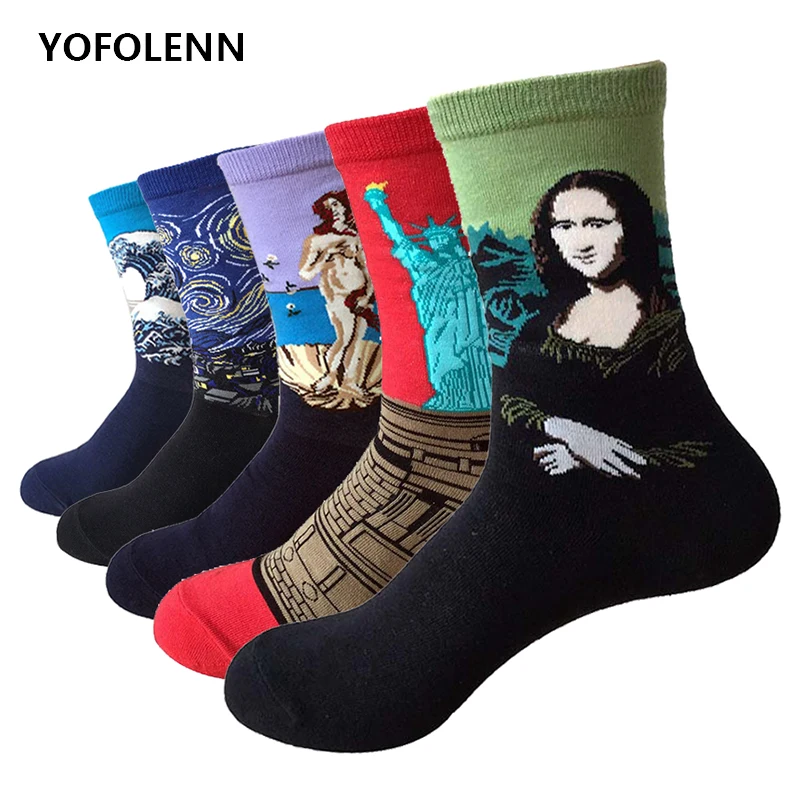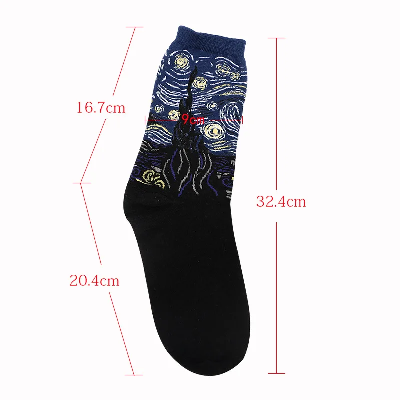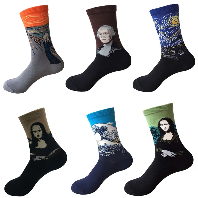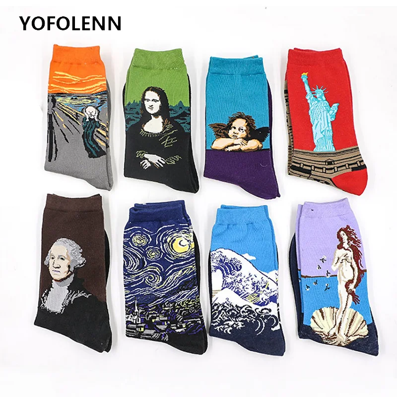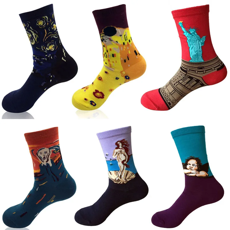 Смешные Женские носки с 3D принтом масляного цвета из чесаного хлопка индивидуальные художественные носки Ван Гога Фреска Милая пушистая серия всемирно известной живописи