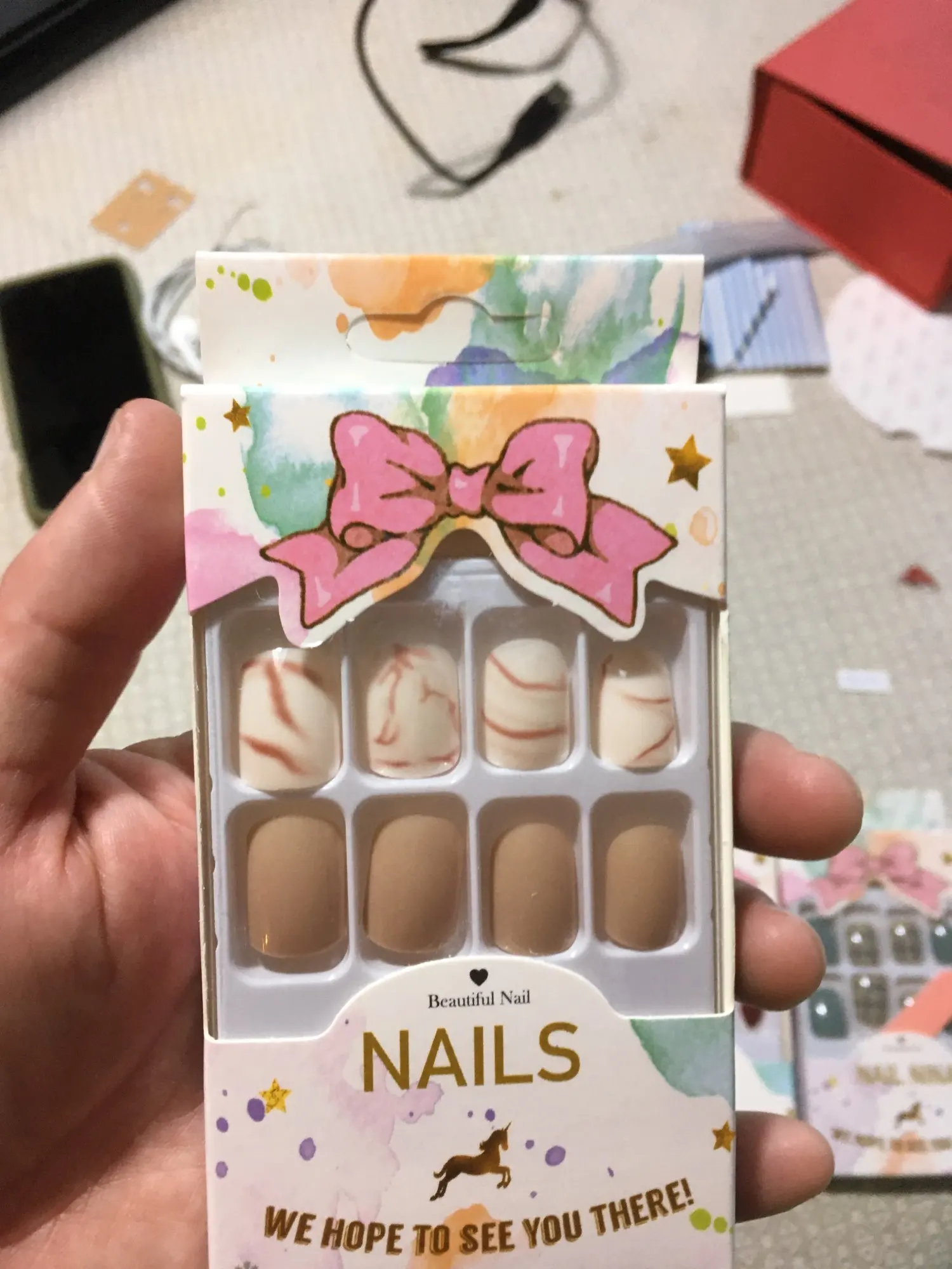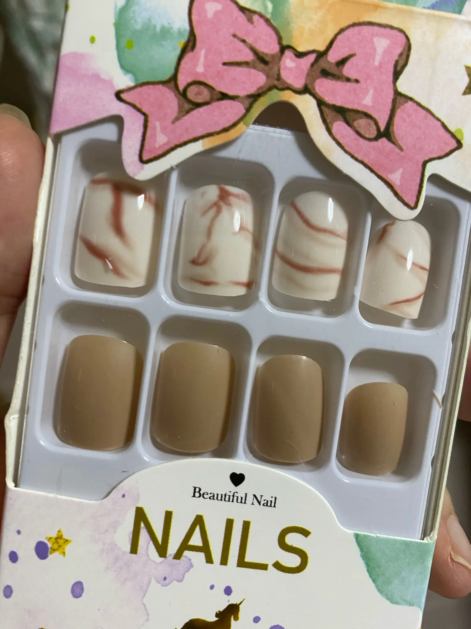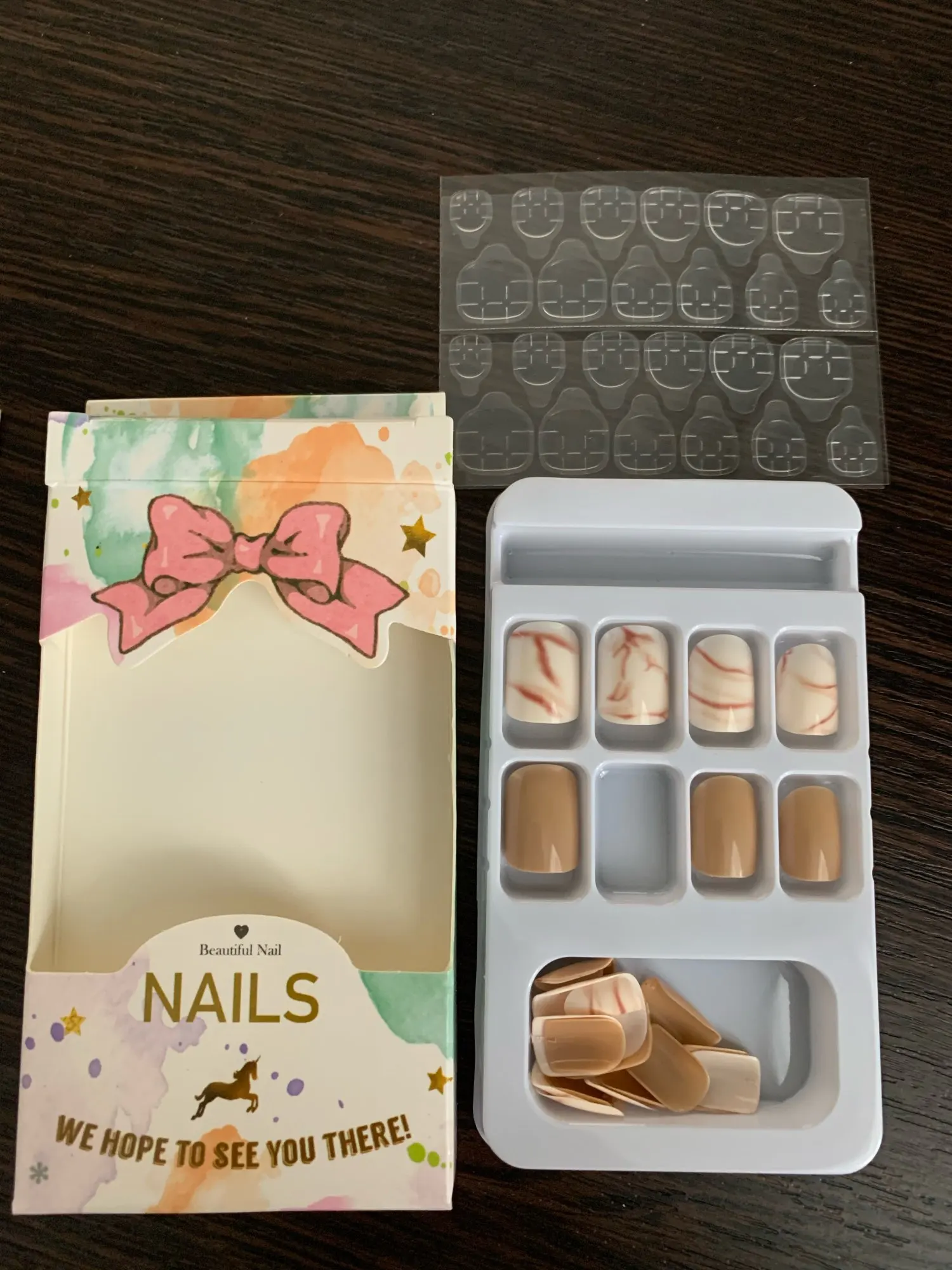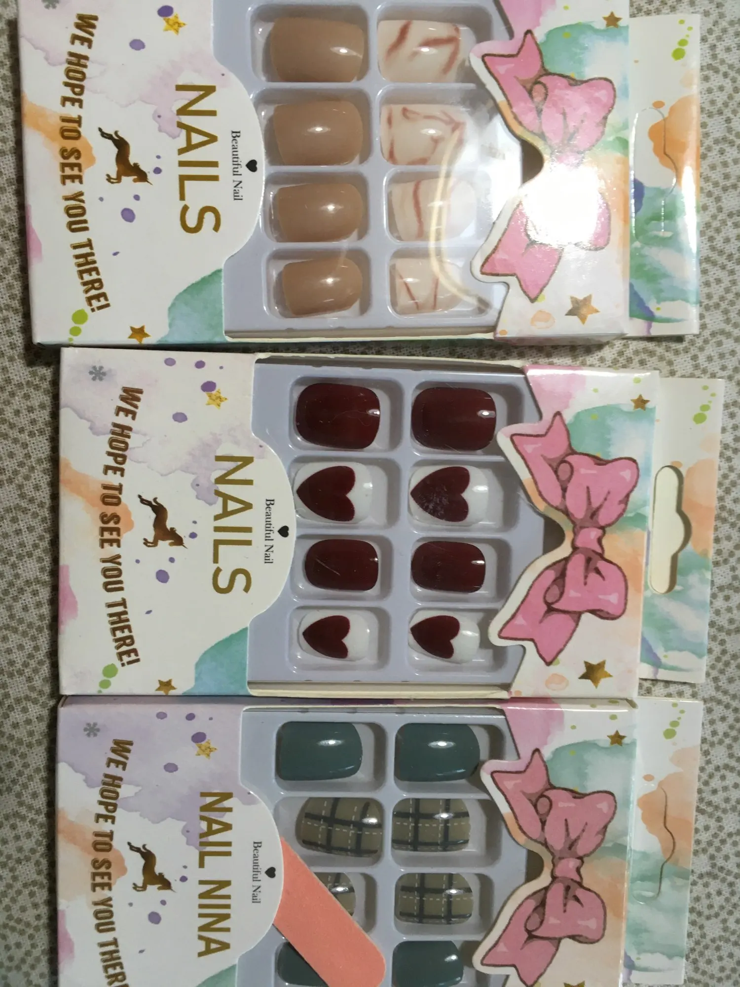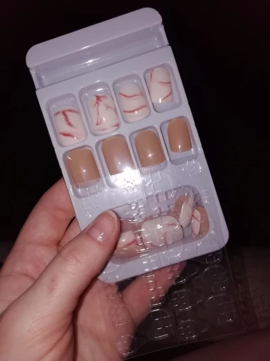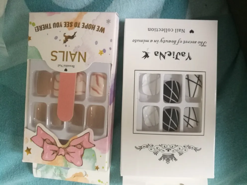Очень милый дизайн и прочные ногти. Смотрятся как свои. Клея нет, есть наклейки, ещё не пробовала на сколько долго они держатся. За такую цену очень хороший товар. Единственный минус в том, что шло около двух месяцев, уже не верила, что дойдёт посылка.