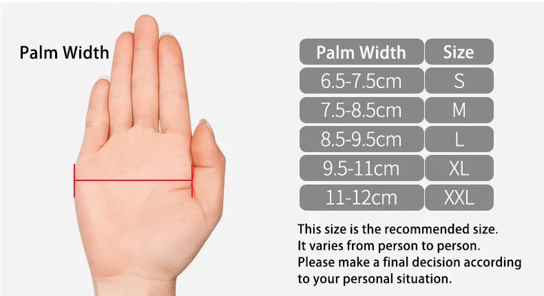 Ширина ладони 9см, выбрал размер L, сели идеально. Хорошее качество, все как на фото.