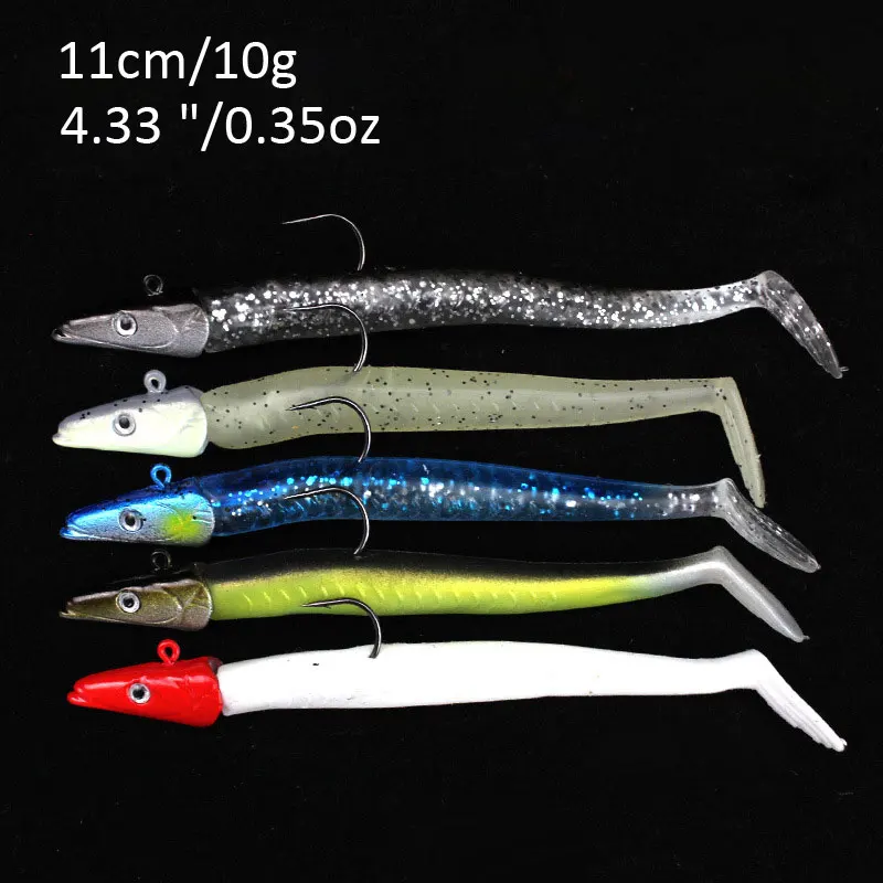 Мягкая рыболовная приманка с реалистичными 3D глазами, свинцовая головка, реалистичное плавание и сильное мягкое тело с блестками для привлечения рыбы. Упаковка 5 шт. 22 г, 4 шт. 16 г, 5 шт. 10 г, длина 11 см.
