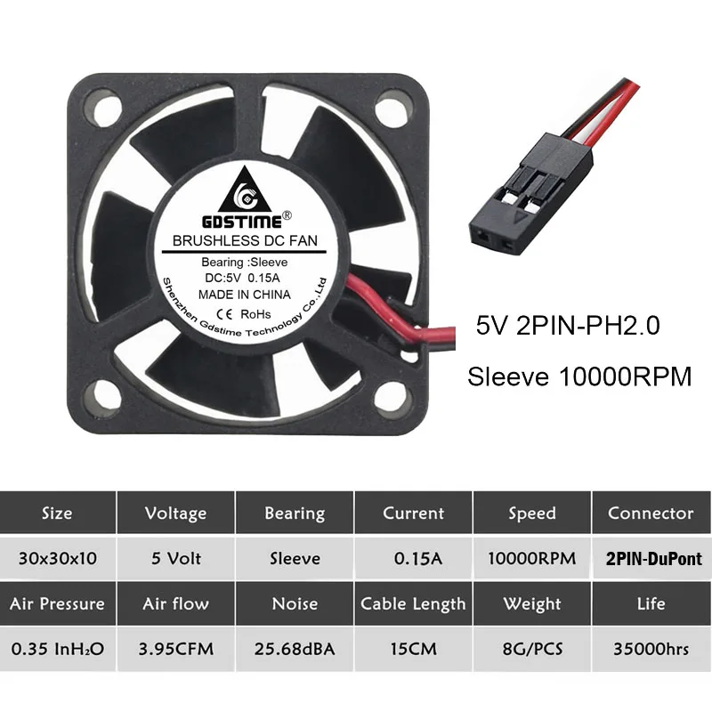 Размеры: 30x30x10mm Номинальное напряжение: 5 В постоянного тока Разъем питания: Dupont 2pin Подшипник Тип: изолирующая трубка Номинальный ток: 0,15 Ампер ± 10% Номинальная скорость: 10000 об/мин ± 10% Поток воздуха: 3,95cfm ± 10% Уровень шума: 25.68dBA ± 10% Срок службы: 35000 часов Длина кабеля: 15 см Вес нетто: 8 г/шт.Количество: