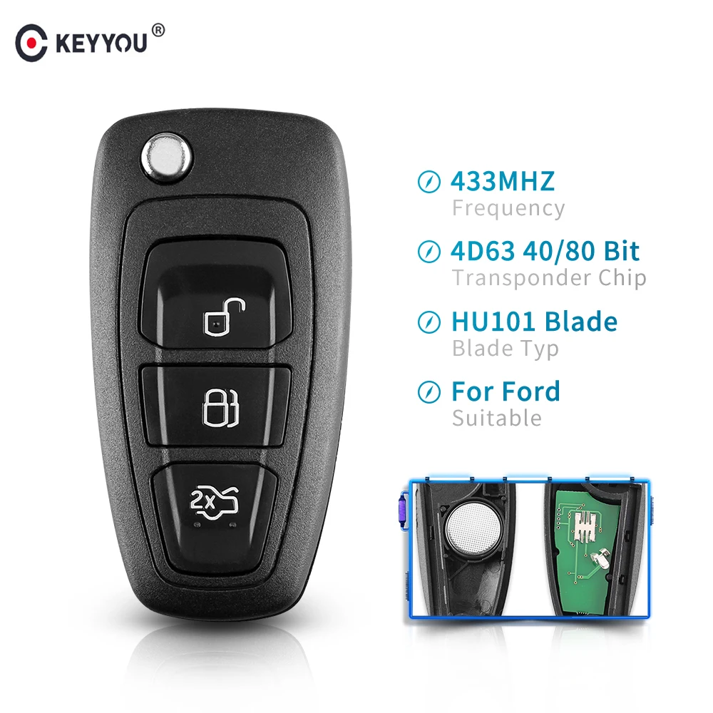 Ключ для автомобиля KEYYOU, складной ключ с 3 кнопками, 315433 МГц, 4D63, чип для FORD Focus Fiesta Mondeo с HU101 Blade ASK