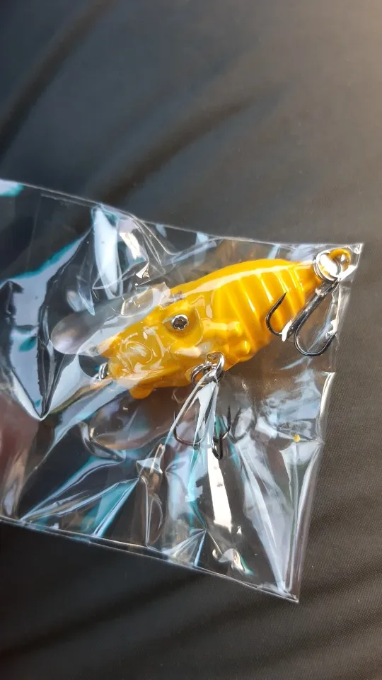 у жёлтой цвет слишком яркий, есть сомнения, будет ли ловиться на неё. в воде крутится вокруг своей оси, шумит (проверяли в ванной). приманка плавает, по весу соответствует заявленному, комплектные крючки отличного качества. выглядит добротно, качественно. доставка в Украину две недели. по сезону разловим
