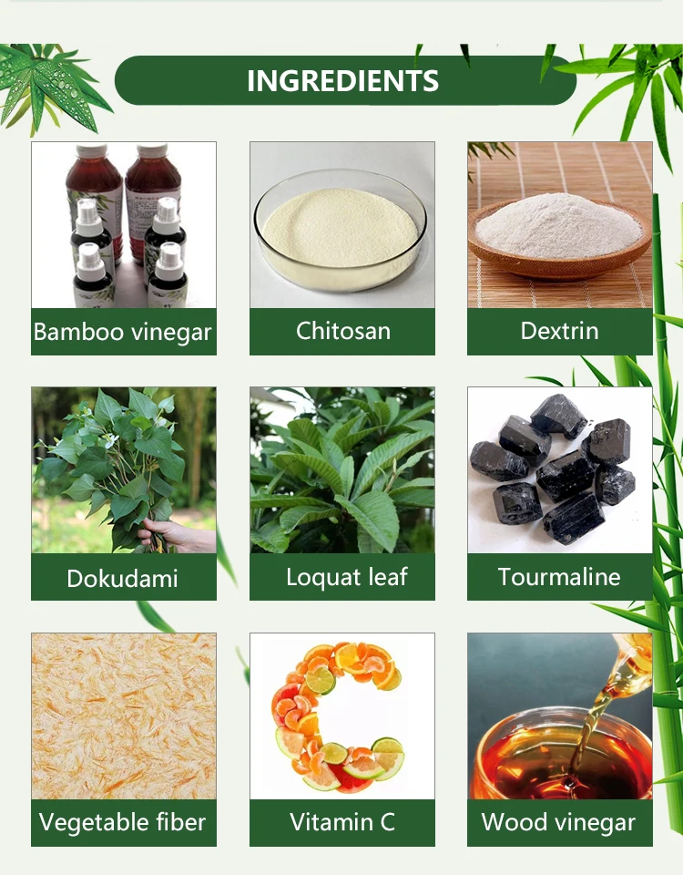 Бамбуковый уксус; Хитозан; Декстрин; Докудами; Лист локата; Турмалин; Растительное волокно; Витамин С; Древесный уксус.