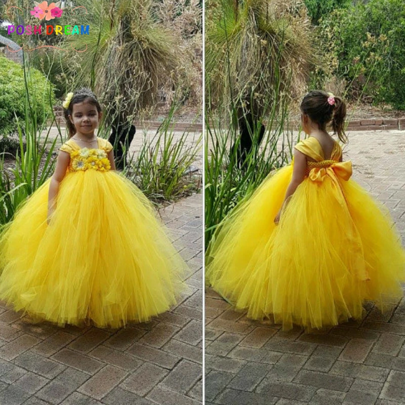 Шикарное платье принцессы для девочек; Желтое платье-пачка с цветами для девочек; Красивое Праздничное желтое платье-пачка ручной работы для девочек