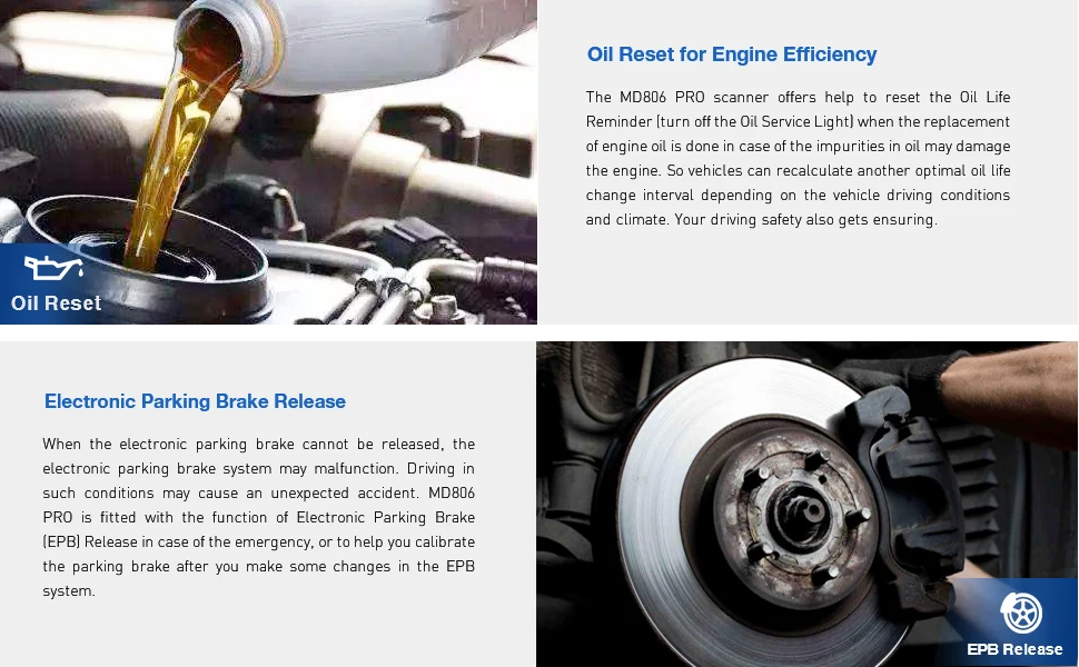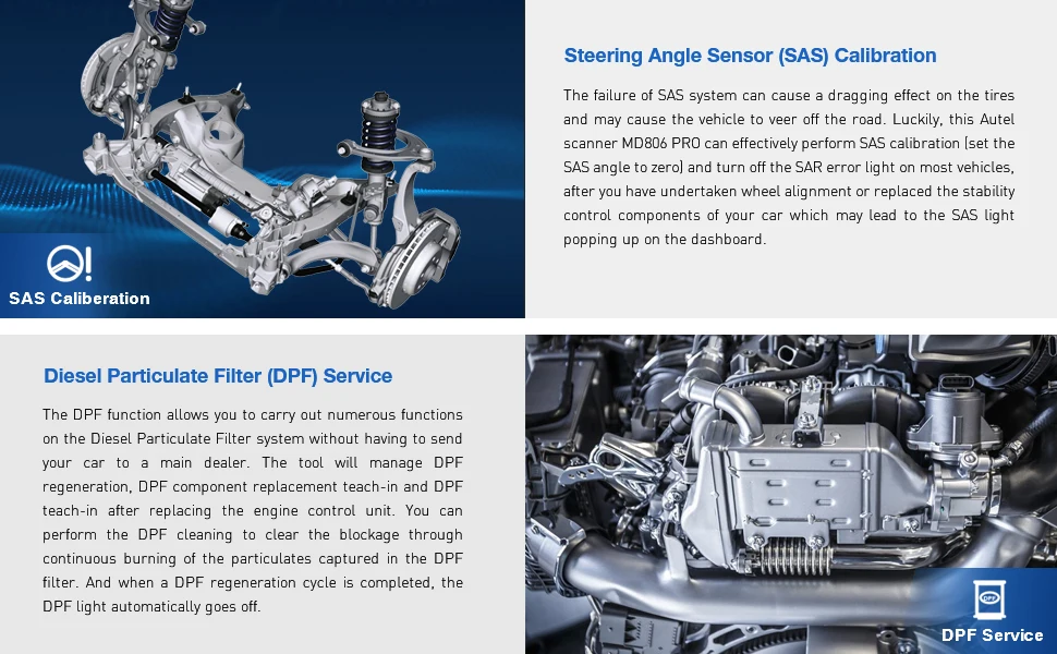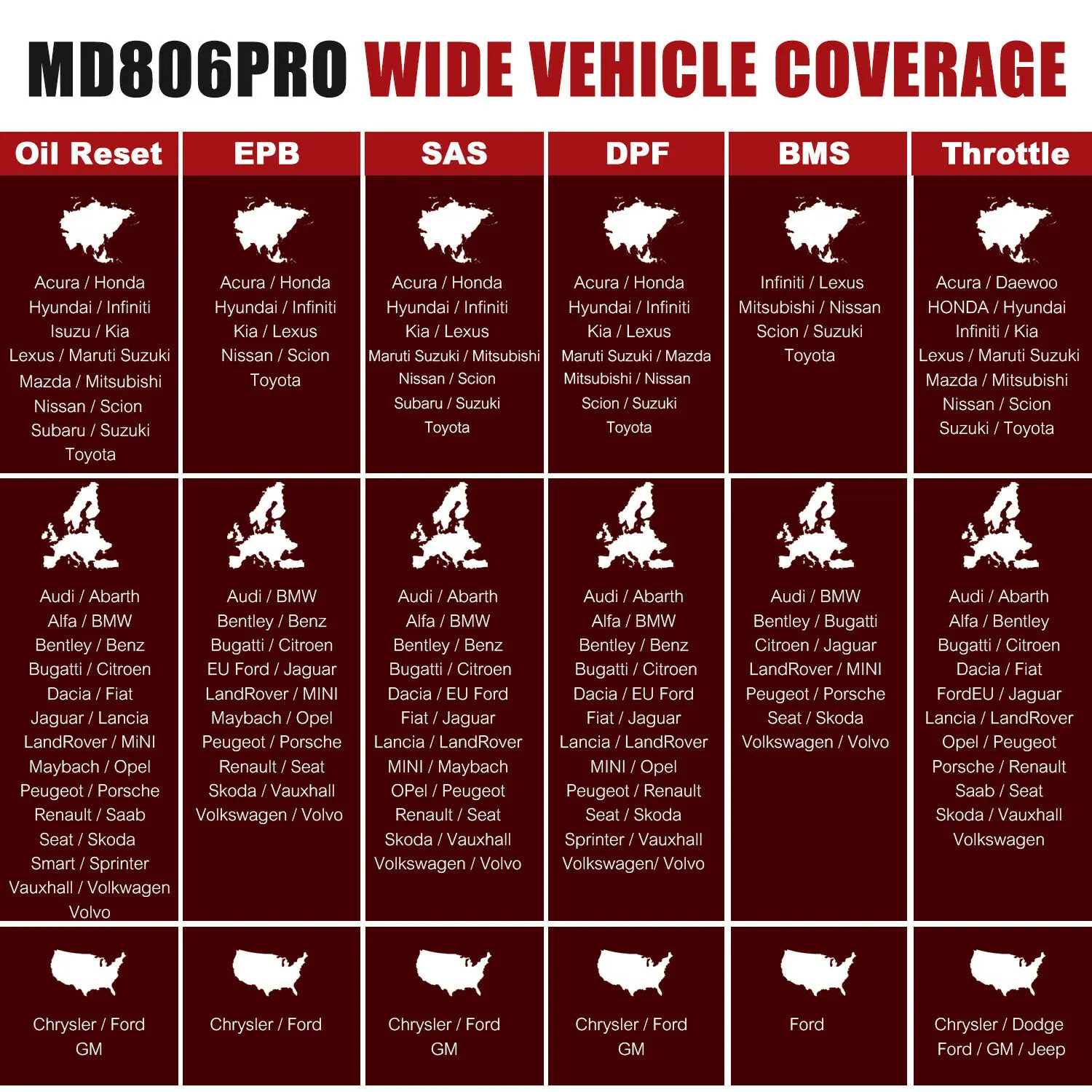 MaxiDIAG MD806 Pro создан, чтобы перевести ваш диагностический опыт на совершенно новый уровень. Загружен сбросом обслуживания масла, регистрация и сброс батареи, парковочная тормозная колодка повторно учатся после замены, датчик угла поворота рулевого управления и дизельные функции регенерации фильтра твердых частиц, MD806 Pro может получить доступ ко всем доступным модулям для лучших операций по диагностике.