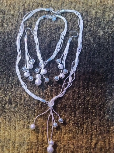 Описание точное. Соответствует фото. Товар бестолковый, хоть и красивый дизайн. Только серьги можно использовать по назначению. Смотрятся они очень красиво. Браслет на руке не держится, так как нет фиксации. Рассчитан на 22-24 р-р. И вся красота картинки превращается в ничто. В колье жёсткие шнуры, имеют постоянную форму, то есть гнуть руками надо. Это портит весь вид и делает колье дешёвым.