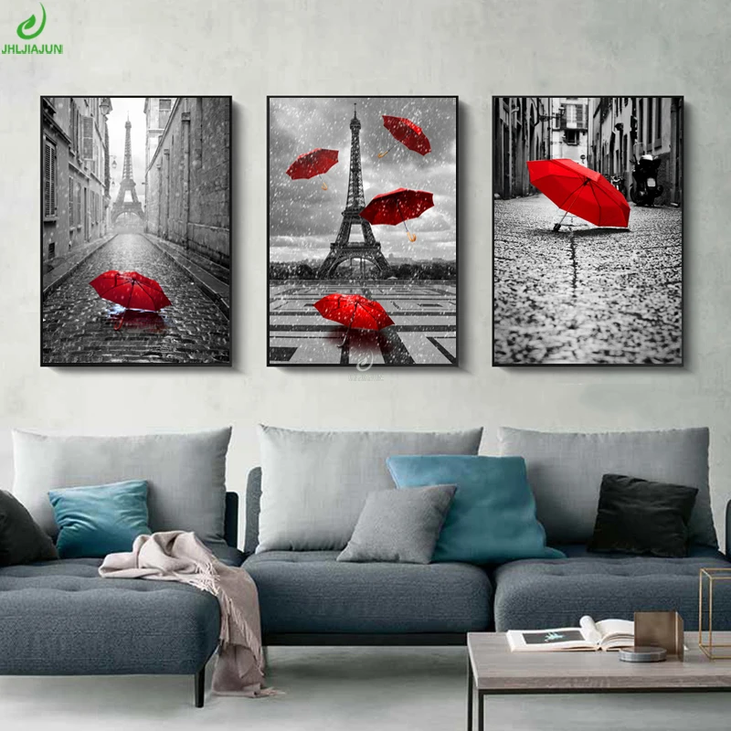 Картина на холсте JHLJIAJUN, скандинавский красный зонт, эйфелевая башня, настенный художественный принт и плакат, современная спальня, гостиная, домашний декор