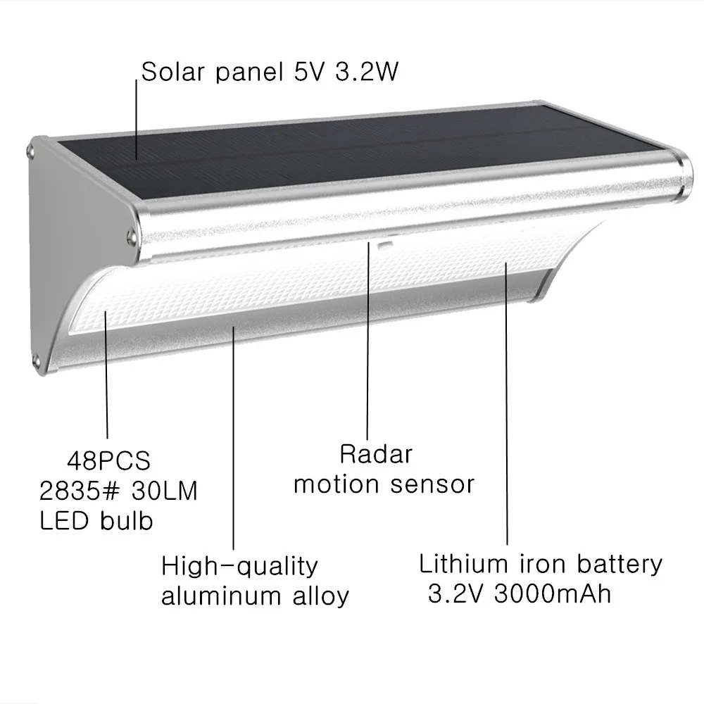 Супер яркий 48 Светодиодный Солнечный движения Сенсор светодиодный светильник 900LM Водонепроницаемый сад стены безопасности лампа микроволновой печи движения встраиваемые тёплогобелый