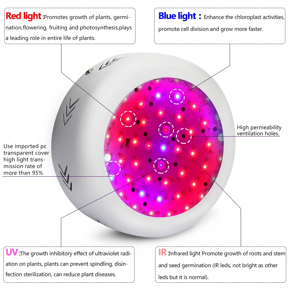 ОсобенностиУф стерилизация, дезинфекцияИК способствует цветению и плодоношениюМощная система охлаждения вентилятора внутри, прохладная и тихая1 шт Сильные Висячие наборы доступны для легкой установкиКомфортное и яркое освещениеОсобенности: Увеличение выхода и уменьшение круга ростаДля: гидропоника овощи, травы и цветущие растения