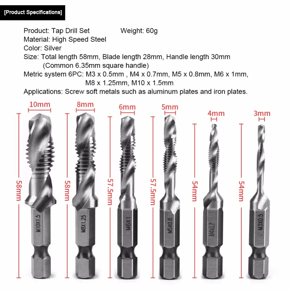 1/4 "шестигранный хвостовик Сверло HSS метрический кран с винтовой резьбой конус и сверла метрические композитные сверла для крана M3 M4 M5 M6 M8 M10