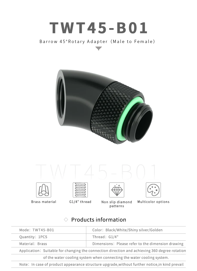 Адаптер для охлаждения воды BARROW G14, поворотный на 45 градусов, золотистый, черный, серебристый, TWT45-B01