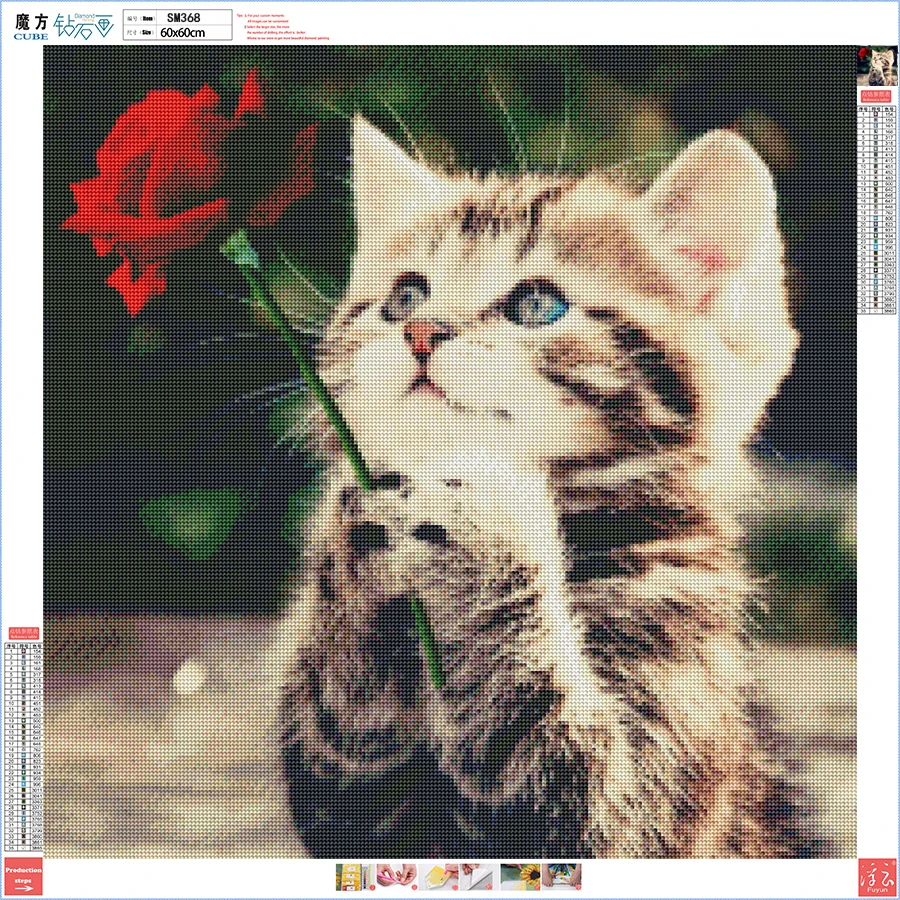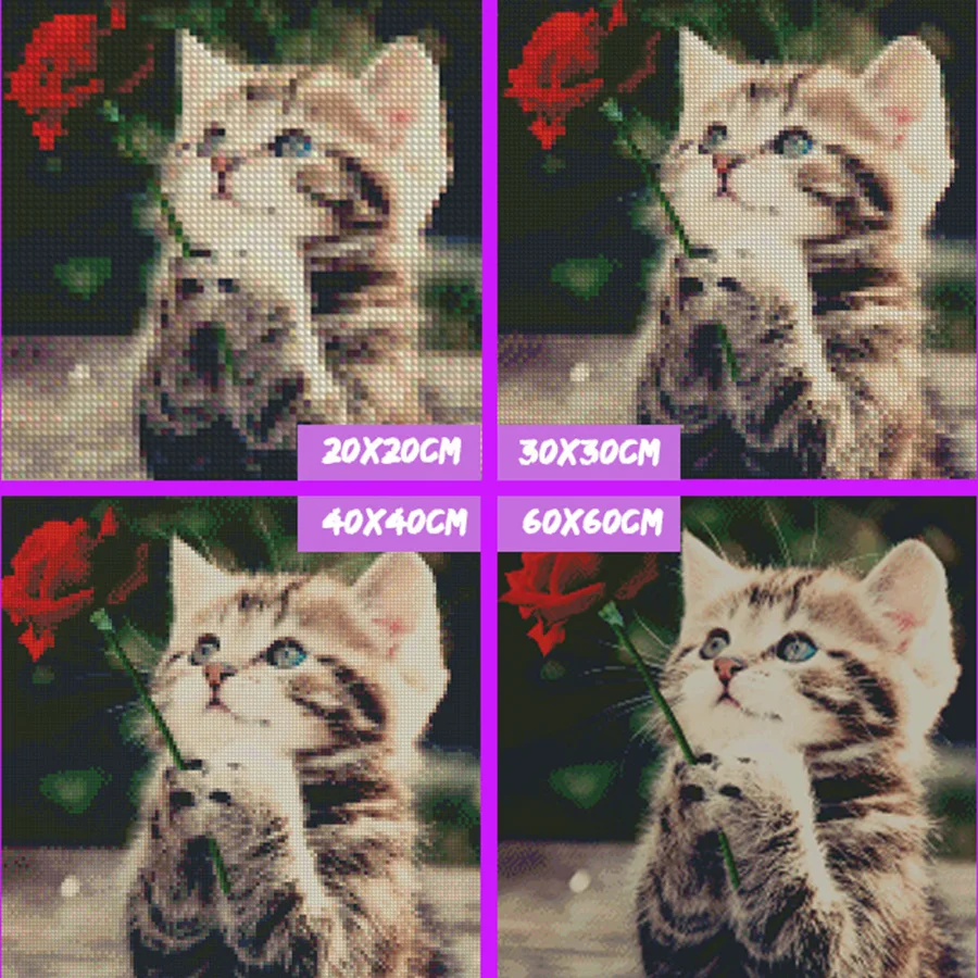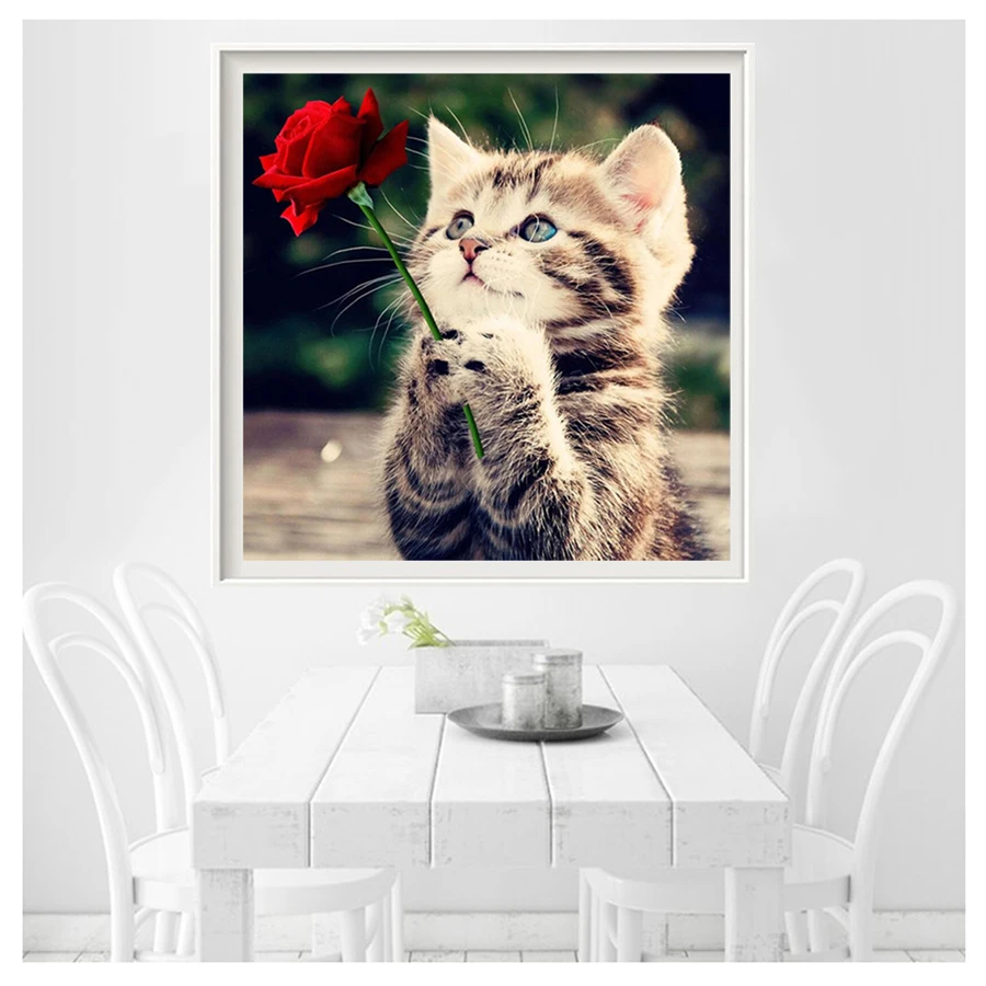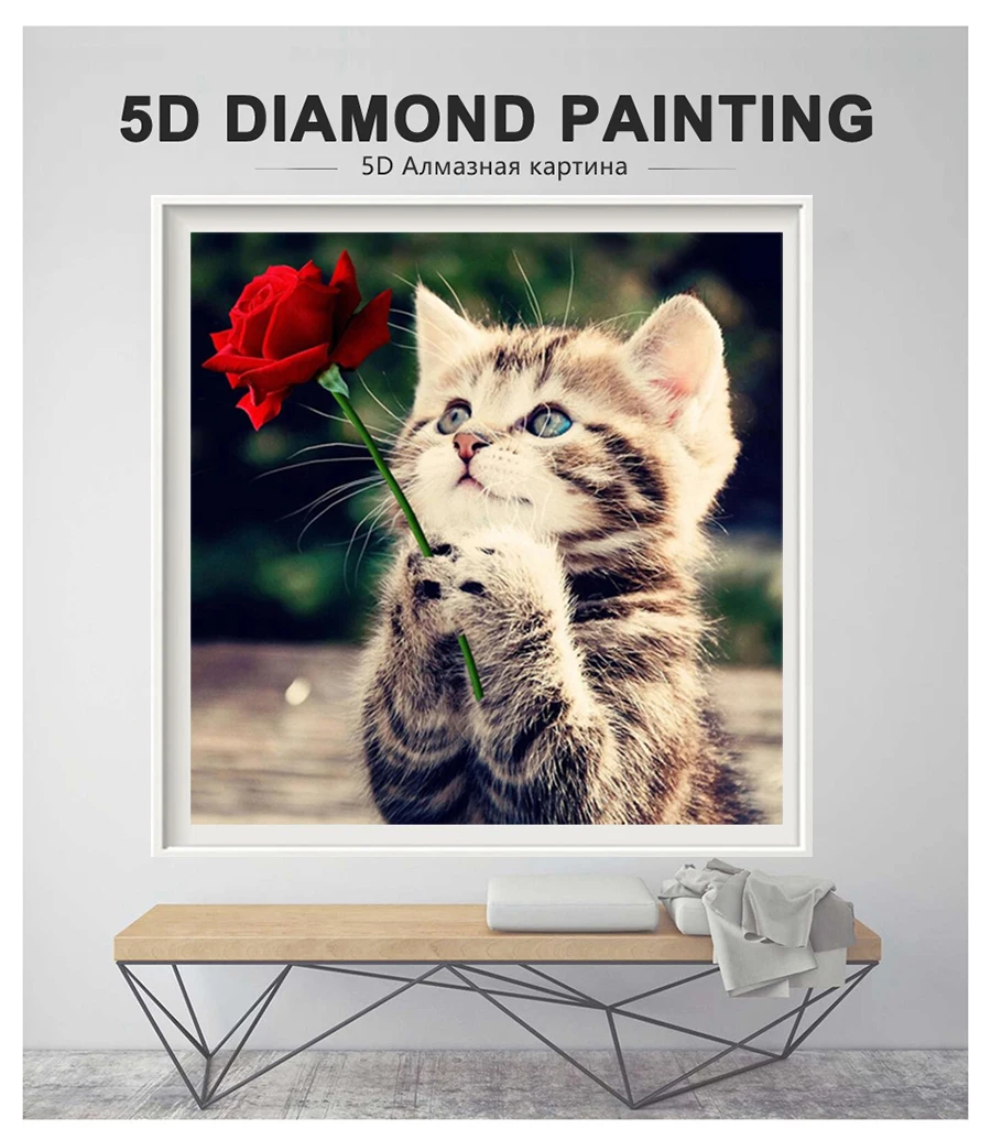 Алмазная живопись 5D "сделай сам", круглая вышивка, кошка с розой, 100% г.